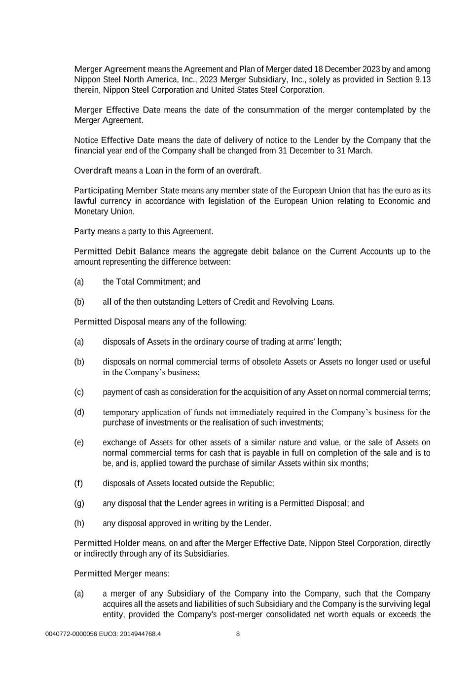 0040772-0000056 EUO3: 2014944768.4 8 Merger Agreement means the Agreement and Plan of Merger dated 18 December 2023 by and among Nippon Steel North America, Inc., 2023 Merger Subsidiary, Inc., solely as provided in Section 9.13 therein, Nippon Steel Corporation and United States Steel Corporation. Merger Effective Date means the date of the consummation of the merger contemplated by the Merger Agreement. Notice Effective Date means the date of delivery of notice to the Lender by the Company that the financial year end of the Company shall be changed from 31 December to 31 March. Overdraft means a Loan in the form of an overdraft. Participating Member State means any member state of the European Union that has the euro as its lawful currency in accordance with legislation of the European Union relating to Economic and Monetary Union. Party means a party to this Agreement. Permitted Debit Balance means the aggregate debit balance on the Current Accounts up to the amount representing the difference between: (a) the Total Commitment; and (b) all of the then outstanding Letters of Credit and Revolving Loans. Permitted Disposal means any of the following: (a) disposals of Assets in the ordinary course of trading at arms' length; (b) disposals on normal commercial terms of obsolete Assets or Assets no longer used or useful in the Company’s business; (c) payment of cash as consideration for the acquisition of any Asset on normal commercial terms; (d) temporary application of funds not immediately required in the Company’s business for the purchase of investments or the realisation of such investments; (e) exchange of Assets for other assets of a similar nature and value, or the sale of Assets on normal commercial terms for cash that is payable in full on completion of the sale and is to be, and is, applied toward the purchase of similar Assets within six months; (f) disposals of Assets located outside the Republic; (g) any disposal that the Lender agrees in writing is a Permitted Disposal; and (h) any disposal approved in writing by the Lender. Permitted Holder means, on and after the Merger Effective Date, Nippon Steel Corporation, directly or indirectly through any of its Subsidiaries. Permitted Merger means: (a) a merger of any Subsidiary of the Company into the Company, such that the Company acquires all the assets and liabilities of such Subsidiary and the Company is the surviving legal entity, provided the Company's post-merger consolidated net worth equals or exceeds the