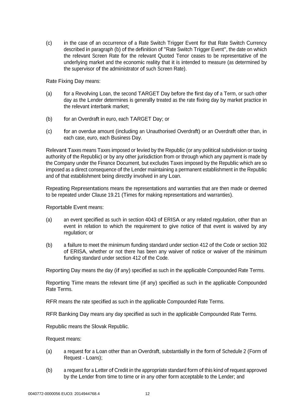 0040772-0000056 EUO3: 2014944768.4 12 (c) in the case of an occurrence of a Rate Switch Trigger Event for that Rate Switch Currency described in paragraph (b) of the definition of "Rate Switch Trigger Event", the date on which the relevant Screen Rate for the relevant Quoted Tenor ceases to be representative of the underlying market and the economic reality that it is intended to measure (as determined by the supervisor of the administrator of such Screen Rate). Rate Fixing Day means: (a) for a Revolving Loan, the second TARGET Day before the first day of a Term, or such other day as the Lender determines is generally treated as the rate fixing day by market practice in the relevant interbank market; (b) for an Overdraft in euro, each TARGET Day; or (c) for an overdue amount (including an Unauthorised Overdraft) or an Overdraft other than, in each case, euro, each Business Day. Relevant Taxes means Taxes imposed or levied by the Republic (or any political subdivision or taxing authority of the Republic) or by any other jurisdiction from or through which any payment is made by the Company under the Finance Document, but excludes Taxes imposed by the Republic which are so imposed as a direct consequence of the Lender maintaining a permanent establishment in the Republic and of that establishment being directly involved in any Loan. Repeating Representations means the representations and warranties that are then made or deemed to be repeated under Clause 19.21 (Times for making representations and warranties). Reportable Event means: (a) an event specified as such in section 4043 of ERISA or any related regulation, other than an event in relation to which the requirement to give notice of that event is waived by any regulation; or (b) a failure to meet the minimum funding standard under section 412 of the Code or section 302 of ERISA, whether or not there has been any waiver of notice or waiver of the minimum funding standard under section 412 of the Code. Reporting Day means the day (if any) specified as such in the applicable Compounded Rate Terms. Reporting Time means the relevant time (if any) specified as such in the applicable Compounded Rate Terms. RFR means the rate specified as such in the applicable Compounded Rate Terms. RFR Banking Day means any day specified as such in the applicable Compounded Rate Terms. Republic means the Slovak Republic. Request means: (a) a request for a Loan other than an Overdraft, substantially in the form of Schedule 2 (Form of Request - Loans); (b) a request for a Letter of Credit in the appropriate standard form of this kind of request approved by the Lender from time to time or in any other form acceptable to the Lender; and