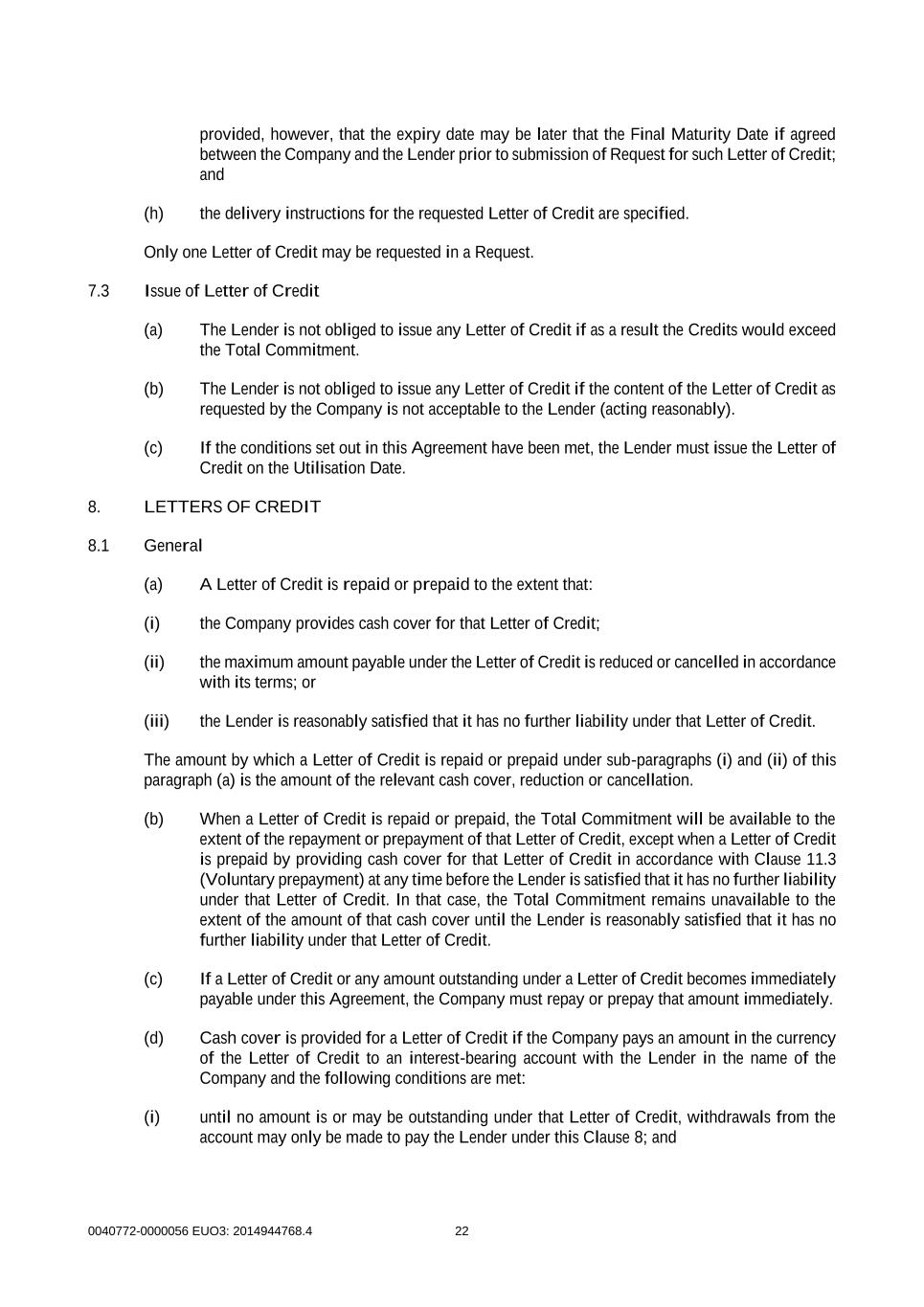0040772-0000056 EUO3: 2014944768.4 22 provided, however, that the expiry date may be later that the Final Maturity Date if agreed between the Company and the Lender prior to submission of Request for such Letter of Credit; and (h) the delivery instructions for the requested Letter of Credit are specified. Only one Letter of Credit may be requested in a Request. 7.3 Issue of Letter of Credit (a) The Lender is not obliged to issue any Letter of Credit if as a result the Credits would exceed the Total Commitment. (b) The Lender is not obliged to issue any Letter of Credit if the content of the Letter of Credit as requested by the Company is not acceptable to the Lender (acting reasonably). (c) If the conditions set out in this Agreement have been met, the Lender must issue the Letter of Credit on the Utilisation Date. 8. LETTERS OF CREDIT 8.1 General (a) A Letter of Credit is repaid or prepaid to the extent that: (i) the Company provides cash cover for that Letter of Credit; (ii) the maximum amount payable under the Letter of Credit is reduced or cancelled in accordance with its terms; or (iii) the Lender is reasonably satisfied that it has no further liability under that Letter of Credit. The amount by which a Letter of Credit is repaid or prepaid under sub-paragraphs (i) and (ii) of this paragraph (a) is the amount of the relevant cash cover, reduction or cancellation. (b) When a Letter of Credit is repaid or prepaid, the Total Commitment will be available to the extent of the repayment or prepayment of that Letter of Credit, except when a Letter of Credit is prepaid by providing cash cover for that Letter of Credit in accordance with Clause 11.3 (Voluntary prepayment) at any time before the Lender is satisfied that it has no further liability under that Letter of Credit. In that case, the Total Commitment remains unavailable to the extent of the amount of that cash cover until the Lender is reasonably satisfied that it has no further liability under that Letter of Credit. (c) If a Letter of Credit or any amount outstanding under a Letter of Credit becomes immediately payable under this Agreement, the Company must repay or prepay that amount immediately. (d) Cash cover is provided for a Letter of Credit if the Company pays an amount in the currency of the Letter of Credit to an interest-bearing account with the Lender in the name of the Company and the following conditions are met: (i) until no amount is or may be outstanding under that Letter of Credit, withdrawals from the account may only be made to pay the Lender under this Clause 8; and