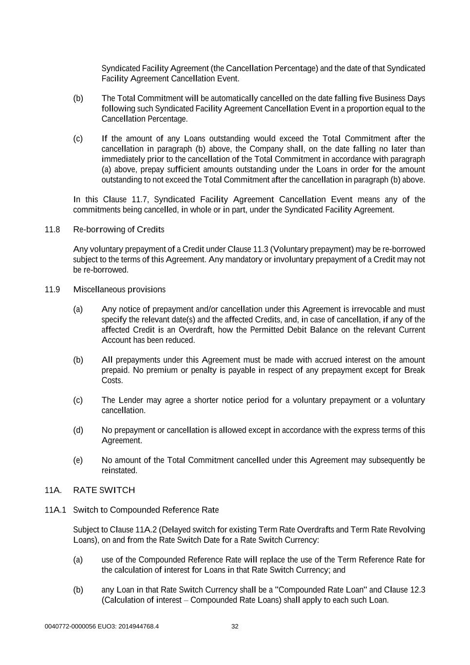 0040772-0000056 EUO3: 2014944768.4 32 Syndicated Facility Agreement (the Cancellation Percentage) and the date of that Syndicated Facility Agreement Cancellation Event. (b) The Total Commitment will be automatically cancelled on the date falling five Business Days following such Syndicated Facility Agreement Cancellation Event in a proportion equal to the Cancellation Percentage. (c) If the amount of any Loans outstanding would exceed the Total Commitment after the cancellation in paragraph (b) above, the Company shall, on the date falling no later than immediately prior to the cancellation of the Total Commitment in accordance with paragraph (a) above, prepay sufficient amounts outstanding under the Loans in order for the amount outstanding to not exceed the Total Commitment after the cancellation in paragraph (b) above. In this Clause 11.7, Syndicated Facility Agreement Cancellation Event means any of the commitments being cancelled, in whole or in part, under the Syndicated Facility Agreement. 11.8 Re-borrowing of Credits Any voluntary prepayment of a Credit under Clause 11.3 (Voluntary prepayment) may be re-borrowed subject to the terms of this Agreement. Any mandatory or involuntary prepayment of a Credit may not be re-borrowed. 11.9 Miscellaneous provisions (a) Any notice of prepayment and/or cancellation under this Agreement is irrevocable and must specify the relevant date(s) and the affected Credits, and, in case of cancellation, if any of the affected Credit is an Overdraft, how the Permitted Debit Balance on the relevant Current Account has been reduced. (b) All prepayments under this Agreement must be made with accrued interest on the amount prepaid. No premium or penalty is payable in respect of any prepayment except for Break Costs. (c) The Lender may agree a shorter notice period for a voluntary prepayment or a voluntary cancellation. (d) No prepayment or cancellation is allowed except in accordance with the express terms of this Agreement. (e) No amount of the Total Commitment cancelled under this Agreement may subsequently be reinstated. 11A. RATE SWITCH 11A.1 Switch to Compounded Reference Rate Subject to Clause 11A.2 (Delayed switch for existing Term Rate Overdrafts and Term Rate Revolving Loans), on and from the Rate Switch Date for a Rate Switch Currency: (a) use of the Compounded Reference Rate will replace the use of the Term Reference Rate for the calculation of interest for Loans in that Rate Switch Currency; and (b) any Loan in that Rate Switch Currency shall be a "Compounded Rate Loan" and Clause 12.3 (Calculation of interest – Compounded Rate Loans) shall apply to each such Loan.