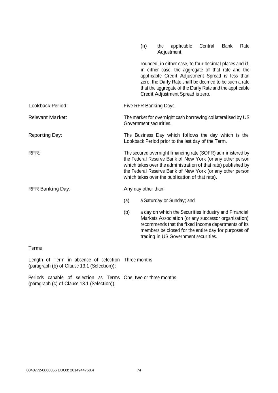 0040772-0000056 EUO3: 2014944768.4 74 (ii) the applicable Central Bank Rate Adjustment, rounded, in either case, to four decimal places and if, in either case, the aggregate of that rate and the applicable Credit Adjustment Spread is less than zero, the Daily Rate shall be deemed to be such a rate that the aggregate of the Daily Rate and the applicable Credit Adjustment Spread is zero. Lookback Period: Five RFR Banking Days. Relevant Market: The market for overnight cash borrowing collateralised by US Government securities. Reporting Day: The Business Day which follows the day which is the Lookback Period prior to the last day of the Term. RFR: The secured overnight financing rate (SOFR) administered by the Federal Reserve Bank of New York (or any other person which takes over the administration of that rate) published by the Federal Reserve Bank of New York (or any other person which takes over the publication of that rate). RFR Banking Day: Any day other than: (a) a Saturday or Sunday; and (b) a day on which the Securities Industry and Financial Markets Association (or any successor organisation) recommends that the fixed income departments of its members be closed for the entire day for purposes of trading in US Government securities. Terms Length of Term in absence of selection (paragraph (b) of Clause 13.1 (Selection)): Three months Periods capable of selection as Terms (paragraph (c) of Clause 13.1 (Selection)): One, two or three months