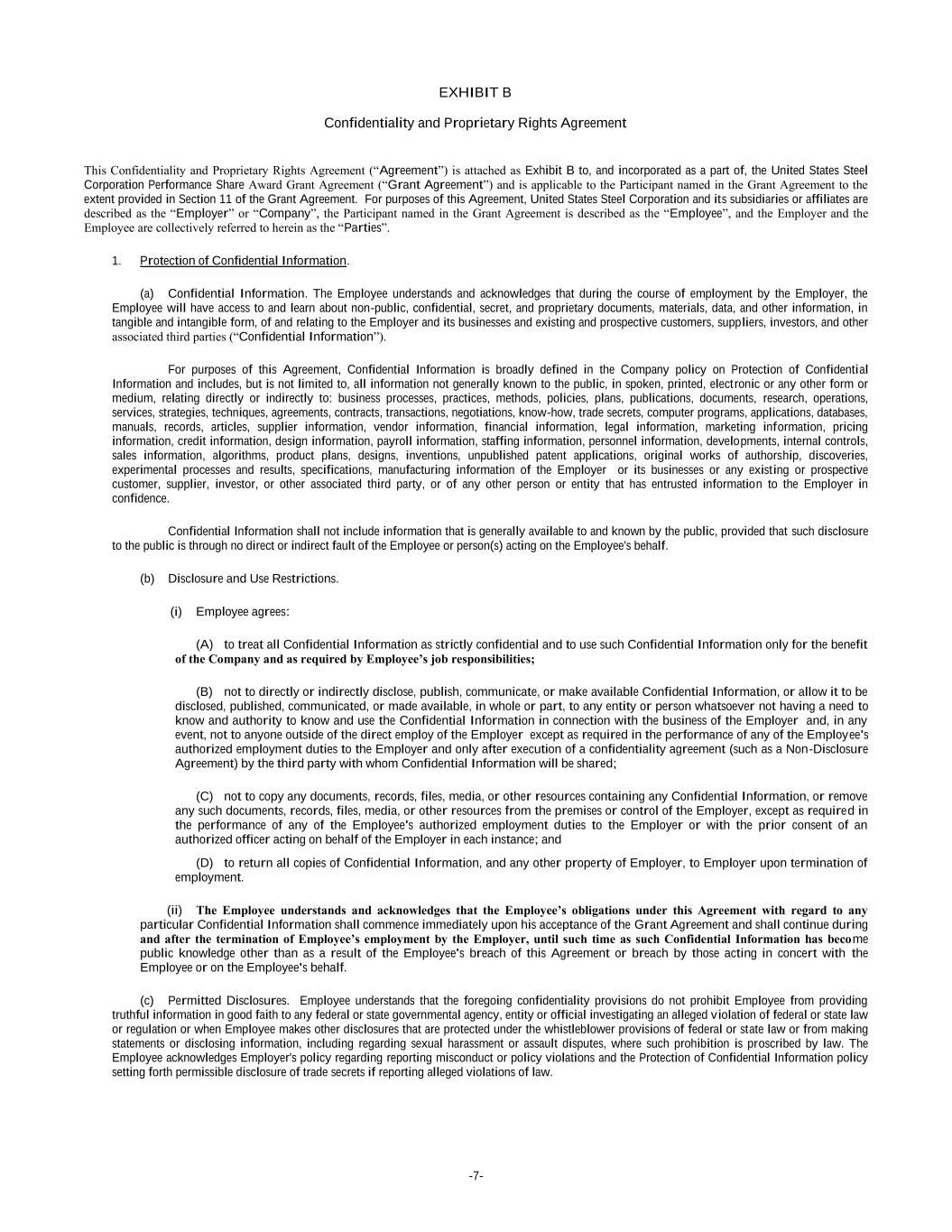 -7- EXHIBIT B Confidentiality and Proprietary Rights Agreement This Confidentiality and Proprietary Rights Agreement (“Agreement”) is attached as Exhibit B to, and incorporated as a part of, the United States Steel Corporation Performance Share Award Grant Agreement (“Grant Agreement”) and is applicable to the Participant named in the Grant Agreement to the extent provided in Section 11 of the Grant Agreement. For purposes of this Agreement, United States Steel Corporation and its subsidiaries or affiliates are described as the “Employer” or “Company”, the Participant named in the Grant Agreement is described as the “Employee”, and the Employer and the Employee are collectively referred to herein as the “Parties”. 1. Protection of Confidential Information. (a) Confidential Information. The Employee understands and acknowledges that during the course of employment by the Employer, the Employee will have access to and learn about non-public, confidential, secret, and proprietary documents, materials, data, and other information, in tangible and intangible form, of and relating to the Employer and its businesses and existing and prospective customers, suppliers, investors, and other associated third parties (“Confidential Information”). For purposes of this Agreement, Confidential Information is broadly defined in the Company policy on Protection of Confidential Information and includes, but is not limited to, all information not generally known to the public, in spoken, printed, electronic or any other form or medium, relating directly or indirectly to: business processes, practices, methods, policies, plans, publications, documents, research, operations, services, strategies, techniques, agreements, contracts, transactions, negotiations, know-how, trade secrets, computer programs, applications, databases, manuals, records, articles, supplier information, vendor information, financial information, legal information, marketing information, pricing information, credit information, design information, payroll information, staffing information, personnel information, developments, internal controls, sales information, algorithms, product plans, designs, inventions, unpublished patent applications, original works of authorship, discoveries, experimental processes and results, specifications, manufacturing information of the Employer or its businesses or any existing or prospective customer, supplier, investor, or other associated third party, or of any other person or entity that has entrusted information to the Employer in confidence. Confidential Information shall not include information that is generally available to and known by the public, provided that such disclosure to the public is through no direct or indirect fault of the Employee or person(s) acting on the Employee's behalf. (b) Disclosure and Use Restrictions. (i) Employee agrees: (A) to treat all Confidential Information as strictly confidential and to use such Confidential Information only for the benefit of the Company and as required by Employee’s job responsibilities; (B) not to directly or indirectly disclose, publish, communicate, or make available Confidential Information, or allow it to be disclosed, published, communicated, or made available, in whole or part, to any entity or person whatsoever not having a need to know and authority to know and use the Confidential Information in connection with the business of the Employer and, in any event, not to anyone outside of the direct employ of the Employer except as required in the performance of any of the Employee's authorized employment duties to the Employer and only after execution of a confidentiality agreement (such as a Non-Disclosure Agreement) by the third party with whom Confidential Information will be shared; (C) not to copy any documents, records, files, media, or other resources containing any Confidential Information, or remove any such documents, records, files, media, or other resources from the premises or control of the Employer, except as required in the performance of any of the Employee's authorized employment duties to the Employer or with the prior consent of an authorized officer acting on behalf of the Employer in each instance; and (D) to return all copies of Confidential Information, and any other property of Employer, to Employer upon termination of employment. (ii) The Employee understands and acknowledges that the Employee’s obligations under this Agreement with regard to any particular Confidential Information shall commence immediately upon his acceptance of the Grant Agreement and shall continue during and after the termination of Employee’s employment by the Employer, until such time as such Confidential Information has become public knowledge other than as a result of the Employee's breach of this Agreement or breach by those acting in concert with the Employee or on the Employee's behalf. (c) Permitted Disclosures. Employee understands that the foregoing confidentiality provisions do not prohibit Employee from providing truthful information in good faith to any federal or state governmental agency, entity or official investigating an alleged violation of federal or state law or regulation or when Employee makes other disclosures that are protected under the whistleblower provisions of federal or state law or from making statements or disclosing information, including regarding sexual harassment or assault disputes, where such prohibition is proscribed by law. The Employee acknowledges Employer's policy regarding reporting misconduct or policy violations and the Protection of Confidential Information policy setting forth permissible disclosure of trade secrets if reporting alleged violations of law.