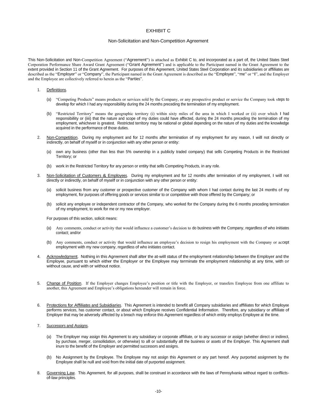 -10- EXHIBIT C Non-Solicitation and Non-Competition Agreement This Non-Solicitation and Non-Competition Agreement (“Agreement”) is attached as Exhibit C to, and incorporated as a part of, the United States Steel Corporation Performance Share Award Grant Agreement (“Grant Agreement”) and is applicable to the Participant named in the Grant Agreement to the extent provided in Section 11 of the Grant Agreement. For purposes of this Agreement, United States Steel Corporation and its subsidiaries or affiliates are described as the “Employer” or “Company”, the Participant named in the Grant Agreement is described as the “Employee”, “me” or “I”, and the Employer and the Employee are collectively referred to herein as the “Parties”. 1. Definitions. (a) “Competing Products” means products or services sold by the Company, or any prospective product or service the Company took steps to develop for which I had any responsibility during the 24 months preceding the termination of my employment. (b) “Restricted Territory” means the geographic territory (i) within sixty miles of the area in which I worked or (ii) over which I had responsibility or (iii) that the nature and scope of my duties could have affected, during the 24 months preceding the termination of my employment, whichever is greatest. Restricted territory may be national or global depending on the nature of my duties and the knowledge acquired in the performance of those duties. 2. Non-Competition. During my employment and for 12 months after termination of my employment for any reason, I will not directly or indirectly, on behalf of myself or in conjunction with any other person or entity: (a) own any business (other than less than 5% ownership in a publicly traded company) that sells Competing Products in the Restricted Territory; or (b) work in the Restricted Territory for any person or entity that sells Competing Products, in any role. 3. Non-Solicitation of Customers & Employees. During my employment and for 12 months after termination of my employment, I will not directly or indirectly, on behalf of myself or in conjunction with any other person or entity: (a) solicit business from any customer or prospective customer of the Company with whom I had contact during the last 24 months of my employment, for purposes of offering goods or services similar to or competitive with those offered by the Company; or (b) solicit any employee or independent contractor of the Company, who worked for the Company during the 6 months preceding termination of my employment, to work for me or my new employer. For purposes of this section, solicit means: (a) Any comments, conduct or activity that would influence a customer’s decision to do business with the Company, regardless of who initiates contact; and/or (b) Any comments, conduct or activity that would influence an employee’s decision to resign his employment with the Company or accept employment with my new company, regardless of who initiates contact. 4. Acknowledgment. Nothing in this Agreement shall alter the at-will status of the employment relationship between the Employer and the Employee, pursuant to which either the Employer or the Employee may terminate the employment relationship at any time, with or without cause, and with or without notice. 5. Change of Position. If the Employer changes Employee’s position or title with the Employer, or transfers Employee from one affiliate to another, this Agreement and Employee’s obligations hereunder will remain in force. 6. Protections for Affiliates and Subsidiaries. This Agreement is intended to benefit all Company subsidiaries and affiliates for which Employee performs services, has customer contact, or about which Employee receives Confidential Information. Therefore, any subsidiary or affiliate of Employer that may be adversely affected by a breach may enforce this Agreement regardless of which entity employs Employee at the time. 7. Successors and Assigns. (a) The Employer may assign this Agreement to any subsidiary or corporate affiliate, or to any successor or assign (whether direct or indirect, by purchase, merger, consolidation, or otherwise) to all or substantially all the business or assets of the Employer. This Agreement shall inure to the benefit of the Employer and permitted successors and assigns. (b) No Assignment by the Employee. The Employee may not assign this Agreement or any part hereof. Any purported assignment by the Employee shall be null and void from the initial date of purported assignment. 8. Governing Law. This Agreement, for all purposes, shall be construed in accordance with the laws of Pennsylvania without regard to conflicts- of-law principles.