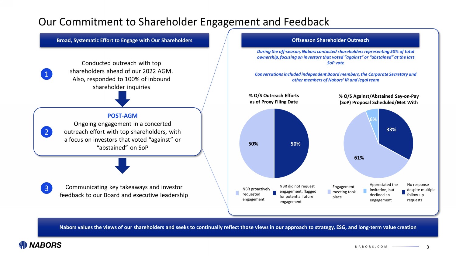 NABORS.COM 3 Our Commitment to Shareholder Engagement and Feedback Broad, Systematic Effort to Engage with Our Shareholders Offseason Shareholder Outreach Nabors values the views of our shareholders and seeks to continually reflect those views in our approach to strategy, ESG, an d l ong - term value creation During the off - season, Nabors contacted shareholders representing 50 % of total ownership, focusing on investors that voted “against” or “abstained” at the last SoP vote Conversations included independent Board members, the Corporate Secretary and other members of Nabors’ IR and legal team POST - AGM Ongoing engagement in a concerted outreach effort with top shareholders, with a focus on investors that voted “against” or “abstained” on SoP 1 Communicating key takeaways and investor feedback to our Board and executive leadership 2 Conducted outreach with top shareholders ahead of our 2022 AGM . Also, responded to 100% of inbound shareholder inquiries 3 50% 50% 33% 61% 6% % O/S Outreach Efforts as of Proxy Filing Date % O/S Against/Abstained Say - on - Pay ( SoP ) Proposal Scheduled/Met With NBR proactively requested engagement NBR did not request engagement; flagged for potential future engagement Engagement meeting took place No response despite multiple follow - up requests Appreciated the invitation, but declined an engagement
