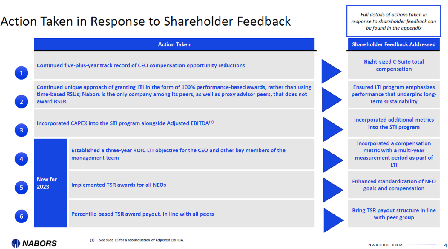 NABORS.COM 4 Action Taken in Response to Shareholder Feedback Action Taken Shareholder Feedback Addressed Continued five - plus - year track record of CEO compensation opportunity reductions Reduced C - Suite total compensation Continued unique approach of granting LTI in the form of 100% performance - based awards, rather than using time - based RSUs; Nabors is the only company among its peers, as well as proxy advisor peers, that does not award RSUs Ensured LTI program emphasizes performance that underpins long - term sustainability Incorporated CAPEX into the STI program alongside Adjusted EBITDA (1) Incorporated additional metrics into the STI program New for 2023 Established a three - year ROIC LTI objective for the CEO and other key members of the management team Incorporated a compensation metric with a multi - year measurement period as part of LTI Implemented TSR awards for all NEOs Enhanced standardization of NEO goals and compensation Percentile - based TSR award payout, in line with all peers Bring TSR payout structure in line with peer group 1 2 3 4 5 Full details of actions taken in response to shareholder feedback can be found in the appendix (1) See slide 13 for a reconciliation of Adjusted EBITDA. 6