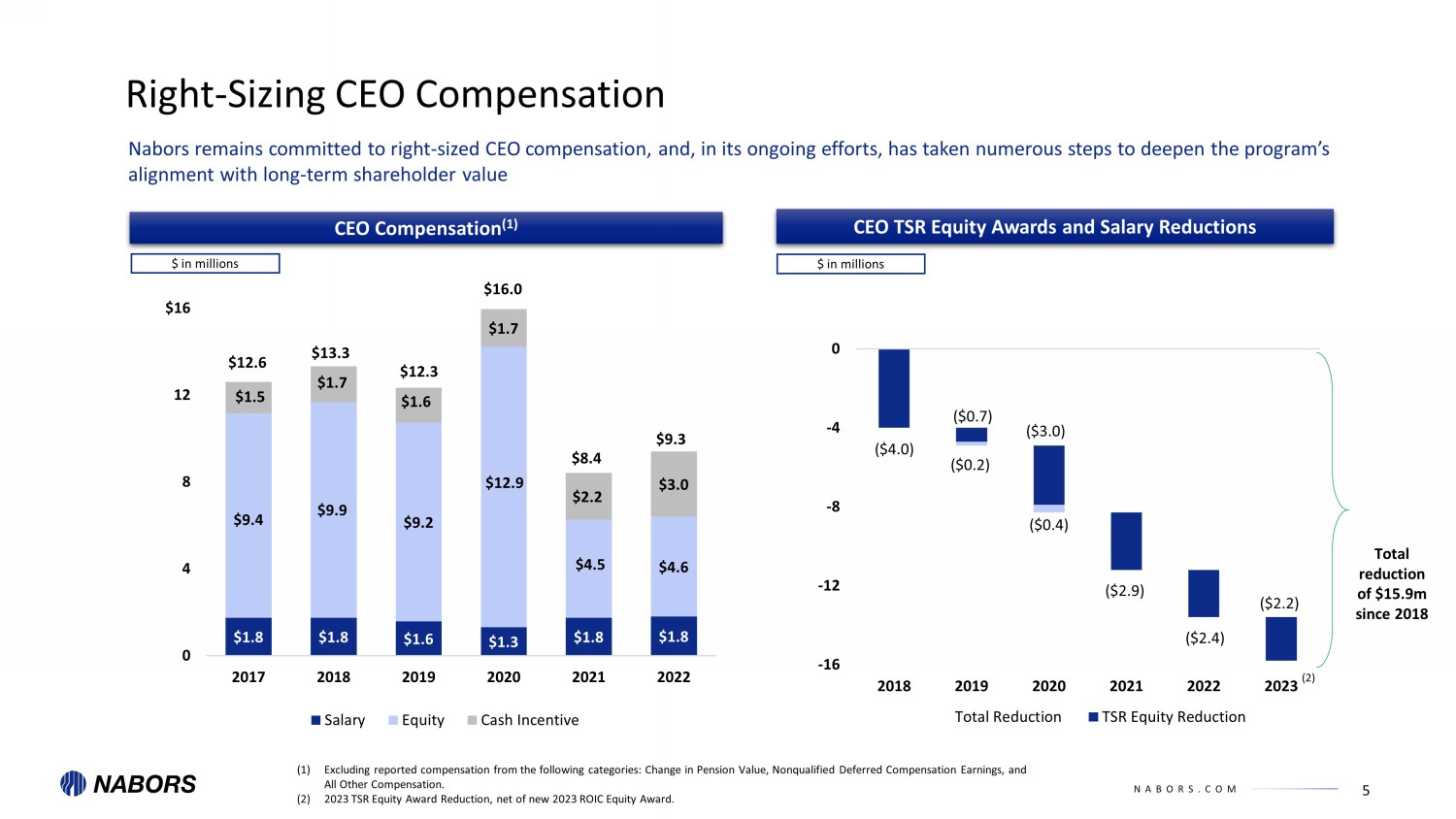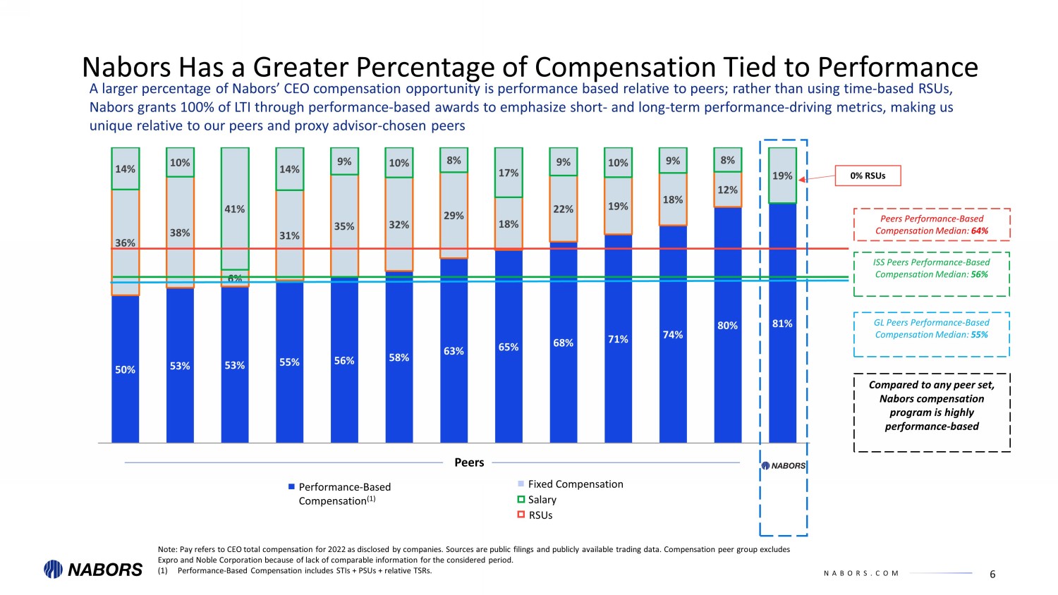 NABORS.COM ($4.0) ($0.7) ($3.0) ($2.9) ($2.4) ($2.2) ($0.2) ($0.4) -16 -12 -8 -4 0 2018 2019 2020 2021 2022 2023 Total Reduction TSR Equity Reduction Right - Sizing CEO Compensation CEO TSR Equity Awards and Salary Reductions Nabors remains committed to right - sized CEO compensation, and, in its ongoing efforts, has taken numerous steps to deepen the pr ogram’s alignment with long - term shareholder value CEO Compensation (1) (1) Excluding reported compensation from the following categories: Change in Pension Value, Nonqualified Deferred Compensation Ea rni ngs, and All Other Compensation. (2) 2023 TSR Equity Award Reduction, net of new 2023 ROIC Equity Award . $1.8 $1.8 $1.6 $1.3 $1.8 $1.8 $9.4 $9.9 $9.2 $12.9 $4.5 $4.6 $1.5 $1.7 $1.6 $1.7 $2.2 $3.0 0 4 8 12 $16 2017 2018 2019 2020 2021 2022 Salary Equity Cash Incentive $ in millions $12.6 $13.3 $12.3 $16.0 $8.4 Total reduction of $15.9m since 2018 5 $ in millions $9.3 (2)