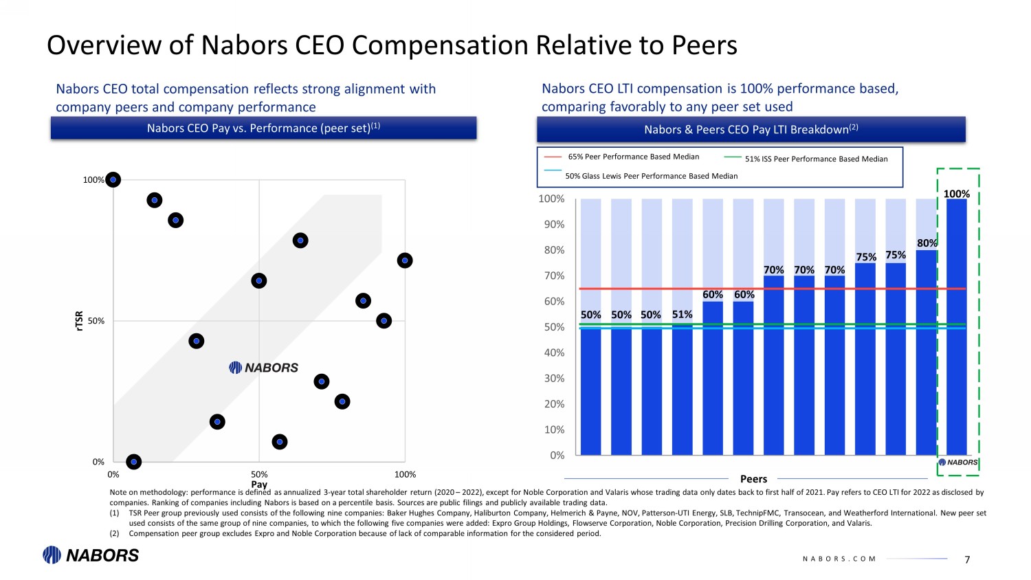 NABORS.COM 6 Nabors Has a Greater Percentage of Compensation Tied to Performance A larger percentage of Nabors’ CEO compensation opportunity is performance based relative to peers; rather than using time - based RSUs, Nabors grants 100% of LTI through performance - based awards to emphasize short - and long - term performance - driving metrics, making us unique relative to our peers and proxy advisor - chosen peers Peers Performance - Based Compensation Median: 64% Peers Note: Pay refers to CEO total compensation for 2022 as disclosed by companies. Sources are public filings and publicly available tr adi ng data. Compensation peer group excludes Expro and Noble Corporation because of lack of comparable information for the considered period. (1) Performance - Based Compensation includes STIs + PSUs + relative TSRs. Salary RSUs Fixed Compensation Performance - Based Compensation (1) 50% 53% 53% 55% 56% 58% 63% 65% 68% 71% 74% 80% 81% 36% 38% 6% 31% 35% 32% 29% 18% 22% 19% 18% 12% 14% 10% 41% 14% 9% 10% 8% 17% 9% 10% 9% 8% 19% FlowServe Transocean Valaris HP Patterson-UTI Baker Hughes Weatherford Precision TechnipFMC SLB NOV Halliburton Nabors 0% RSUs ISS Peers Performance - Based Compensation Median: 56% GL Peers Performance - Based Compensation Median: 55% Compared to any peer set, Nabors compensation program is highly performance - based