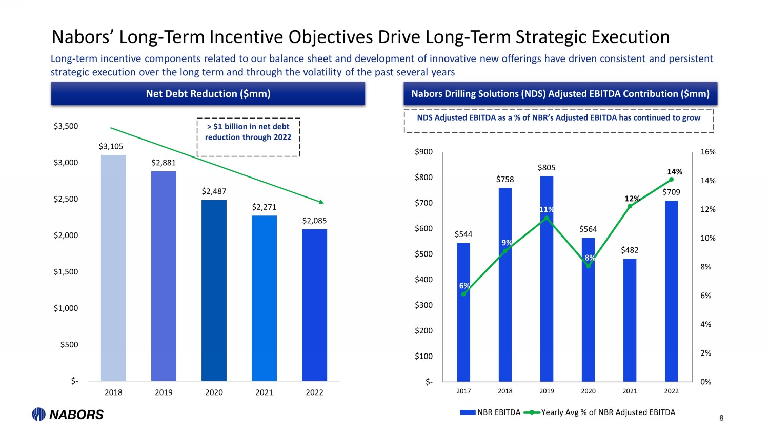NABORS.COM 0% 50% 100% 0% 50% 100% rTSR Pay 50% 50% 50% 51% 60% 60% 70% 70% 70% 75% 75% 80% 100% 0% 10% 20% 30% 40% 50% 60% 70% 80% 90% 100% HP FlowServe Transocean Patterson-UTI Weatherford Baker Hughes Halliburton Precision TechnipFMC NOV SLB Valaris Nabors 7 Overview of Nabors CEO Compensation Relative to Peers Nabors CEO total compensation reflects strong alignment with company peers and company performance Note on methodology: performance is defined as annualized 3 - year total shareholder return (2020 – 2022), except for Noble Corpor ation and Valaris whose trading data only dates back to first half of 2021. Pay refers to CEO LTI for 2022 as disclosed by companies. Ranking of companies including Nabors is based on a percentile basis. Sources are public filings and publicly avai lab le trading data. (1) TSR Peer group previously used consists of the following nine companies: Baker Hughes Company, Haliburton Company, Helmerich & P ayne, NOV, Patterson - UTI Energy, SLB, TechnipFMC, Transocean, and Weatherford International. New peer set used consists of the same group of nine companies, to which the following five companies were added: Expro Group Holdings, Flowserve Corporation, Noble Corporation, Precision Drilling Corporation, and Valaris . (2) Compensation peer group excludes Expro and Noble Corporation because of lack of comparable information for the considered period. Nabors & Peers CEO Pay LTI Breakdown (2) Peers 65% Peer Performance Based Median Nabors CEO LTI compensation is 100% performance based, comparing favorably to any peer set used Nabors CEO Pay vs. Performance (peer set) (1) 51% ISS Peer Performance Based Median 50% Glass Lewis Peer Performance Based Median