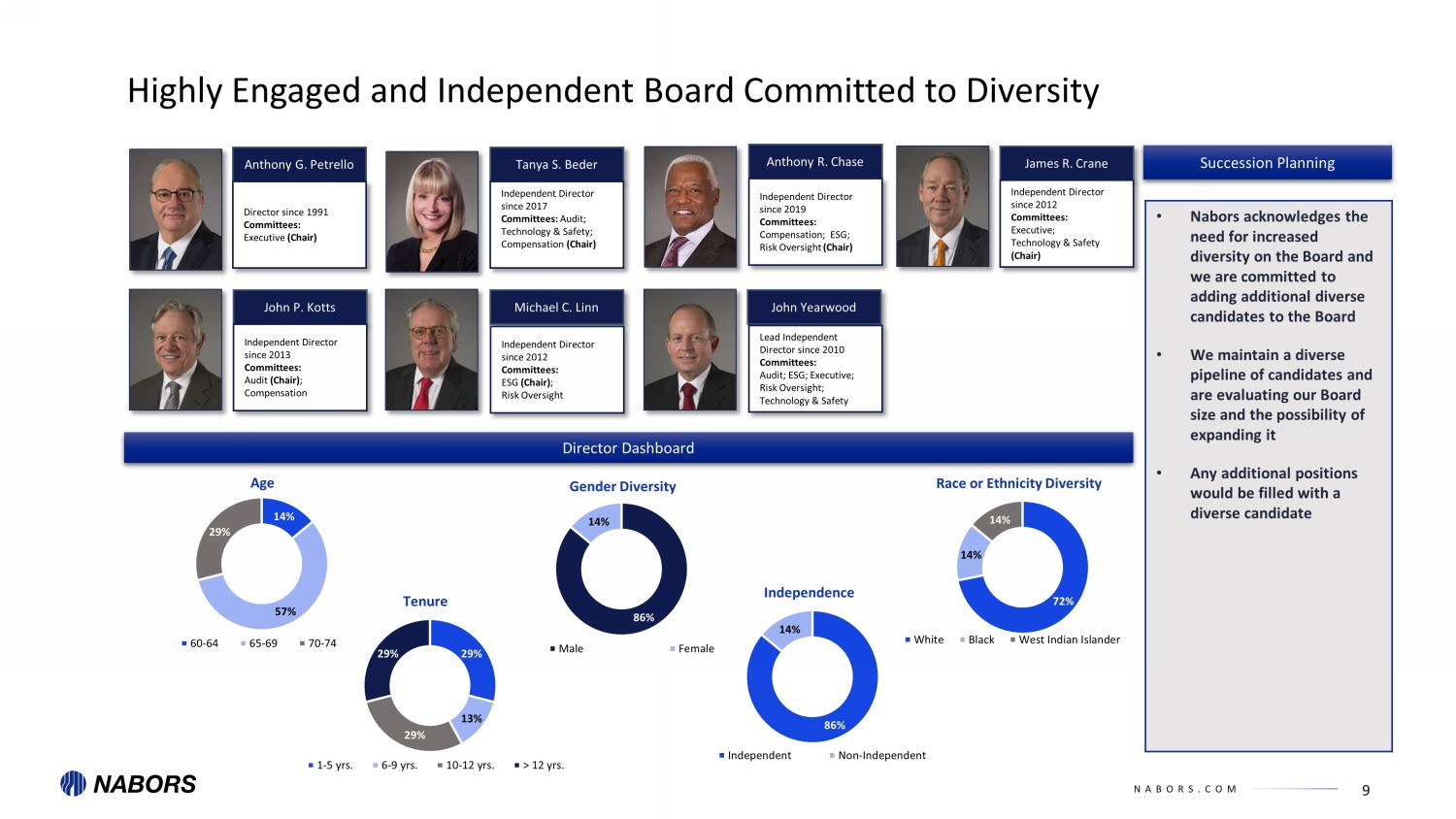 NABORS.COM 9 Highly Engaged and Independent Board Committed to Diversity Anthony G. Petrello John Yearwood James R. Crane John P. Kotts Michael C. Linn Anthony R. Chase Tanya S. Beder Independent Director since 2017 Committees: Audit; Technology & Safety; Compensation (Chair) Director since 1991 Committees: Executive (Chair) Independent Director since 2019 Committees: Compensation; ESG; Risk Oversight (Chair) Independent Director since 2012 Committees: Executive; Technology & Safety (Chair) Independent Director since 2012 Committees: ESG (Chair) ; Risk Oversight Lead Independent Director since 2010 Committees: Audit; ESG; Executive; Risk Oversight; Technology & Safety Independent Director since 2013 Committees: Audit (Chair) ; Compensation 14% 57% 29% Age 60-64 65-69 70-74 29% 13% 29% 29% Tenure 1-5 yrs. 6-9 yrs. 10-12 yrs. > 12 yrs. 86% 14% Gender Diversity Male Female 86% 14% Independence Independent Non-Independent 72% 14% 14% Race or Ethnicity Diversity White Black West Indian Islander Director Dashboard Succession Planning • Nabors acknowledges the need for increased diversity on the Board and we are committed to adding additional diverse candidates to the Board • We maintain a diverse pipeline of candidates and are evaluating our Board size and the possibility of expanding it • Any additional positions would be filled with a diverse candidate