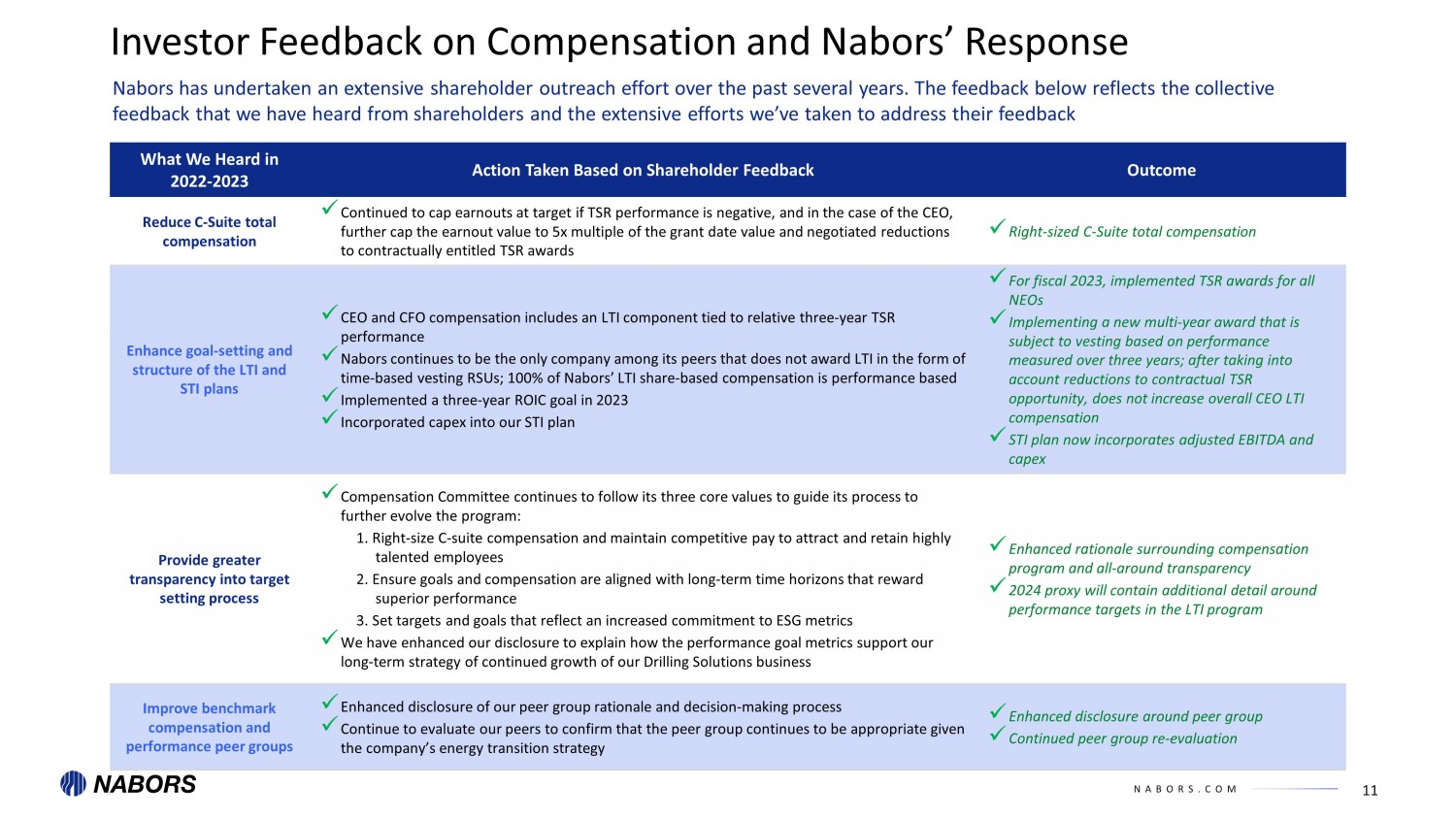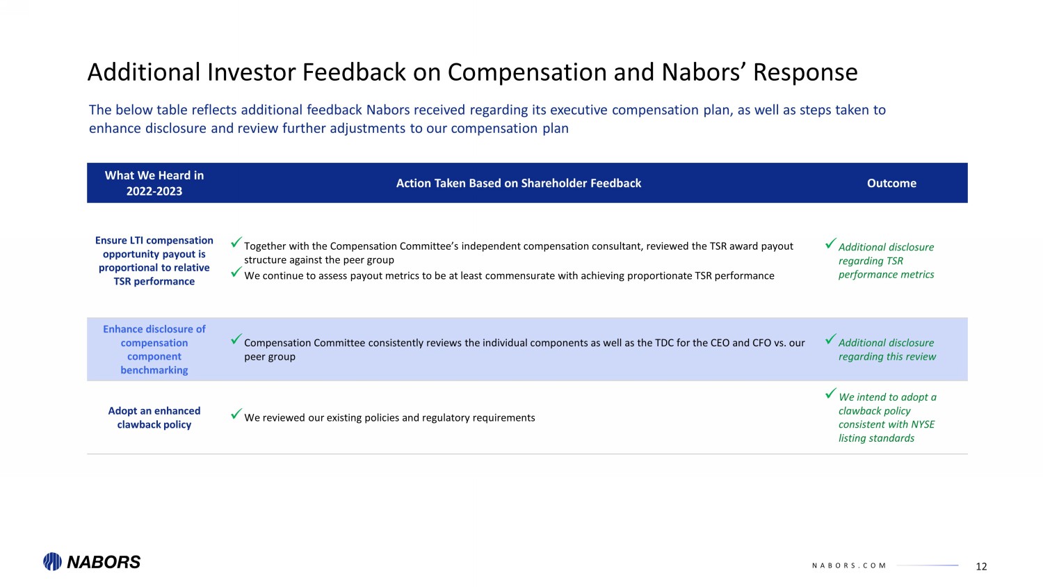 NABORS.COM 11 Investor Feedback on Compensation and Nabors’ Response What We Heard in 2022 - 2023 Action Taken Based on Shareholder Feedback Outcome Reduce C - Suite total compensation x Continued to cap earnouts at target if TSR performance is negative, and in the case of the CEO, further cap the earnout value to 5x multiple of the grant date value and negotiated reductions to contractually entitled TSR awards x Right - sized C - Suite total compensation Enhance goal - setting and structure of the LTI and STI plans x CEO and CFO compensation includes an LTI component tied to relative three - year TSR performance x Nabors continues to be the only company among its peers that does not award LTI in the form of time - based vesting RSUs; 100% of Nabors’ LTI share - based compensation is performance based x Implemented a three - year ROIC goal in 2023 x Incorporated capex into our STI plan x For fiscal 2023, implemented TSR awards for all NEOs x Implementing a new multi - year award that is subject to vesting based on performance measured over three years; after taking into account reductions to contractual TSR opportunity, does not increase overall CEO LTI compensation x STI plan now incorporates adjusted EBITDA and capex Provide greater transparency into target setting process x Compensation Committee continues to follow its three core values to guide its process to further evolve the program: 1. Right - size C - suite compensation and maintain competitive pay to attract and retain highly talented employees 2. Ensure goals and compensation are aligned with long - term time horizons that reward superior performance 3. Set targets and goals that reflect an increased commitment to ESG metrics x We have enhanced our disclosure to explain how the performance goal metrics support our long - term strategy of continued growth of our Drilling Solutions business x Enhanced rationale surrounding compensation program and all - around transparency x 2024 proxy will contain additional detail around performance targets in the LTI program Improve benchmark compensation and performance peer groups x Enhanced disclosure of our peer group rationale and decision - making process x Continue to evaluate our peers to confirm that the peer group continues to be appropriate given the company’s energy transition strategy x Enhanced disclosure around peer group x Continued peer group re - evaluation Nabors has undertaken an extensive shareholder outreach effort over the past several years. The feedback below reflects the c oll ective feedback that we have heard from shareholders and the extensive efforts we’ve taken to address their feedback