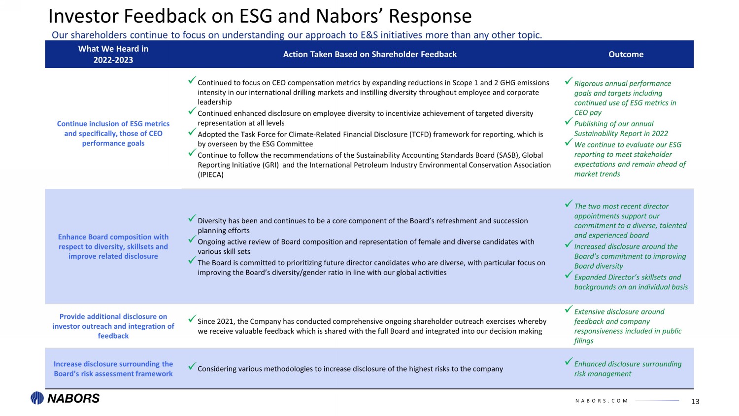 NABORS.COM 12 Additional Investor Feedback on Compensation and Nabors’ Response What We Heard in 2022 - 2023 Action Taken Based on Shareholder Feedback Outcome Ensure LTI compensation opportunity payout is proportional to relative TSR performance x Together with the Compensation Committee’s independent compensation consultant, reviewed the TSR award payout structure against the peer group x We continue to assess payout metrics to be at least commensurate with achieving proportionate TSR performance x Additional disclosure regarding TSR performance metrics Enhance disclosure of compensation component benchmarking x Compensation Committee consistently reviews the individual components as well as the TDC for the CEO and CFO vs. our peer group x Additional disclosure regarding this review Adopt an enhanced clawback policy x We reviewed our existing policies and regulatory requirements x We intend to adopt a clawback policy consistent with NYSE listing standards The below table reflects additional feedback Nabors received regarding its executive compensation plan, as well as steps take n t o enhance disclosure and review further adjustments to our compensation plan