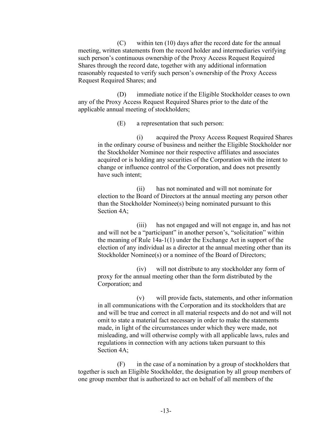 -13- (C) within ten (10) days after the record date for the annual meeting, written statements from the record holder and intermediaries verifying such person’s continuous ownership of the Proxy Access Request Required Shares through the record date, together with any additional information reasonably requested to verify such person’s ownership of the Proxy Access Request Required Shares; and (D) immediate notice if the Eligible Stockholder ceases to own any of the Proxy Access Request Required Shares prior to the date of the applicable annual meeting of stockholders; (E) a representation that such person: (i) acquired the Proxy Access Request Required Shares in the ordinary course of business and neither the Eligible Stockholder nor the Stockholder Nominee nor their respective affiliates and associates acquired or is holding any securities of the Corporation with the intent to change or influence control of the Corporation, and does not presently have such intent; (ii) has not nominated and will not nominate for election to the Board of Directors at the annual meeting any person other than the Stockholder Nominee(s) being nominated pursuant to this Section 4A; (iii) has not engaged and will not engage in, and has not and will not be a “participant” in another person’s, “solicitation” within the meaning of Rule 14a-1(1) under the Exchange Act in support of the election of any individual as a director at the annual meeting other than its Stockholder Nominee(s) or a nominee of the Board of Directors; (iv) will not distribute to any stockholder any form of proxy for the annual meeting other than the form distributed by the Corporation; and (v) will provide facts, statements, and other information in all communications with the Corporation and its stockholders that are and will be true and correct in all material respects and do not and will not omit to state a material fact necessary in order to make the statements made, in light of the circumstances under which they were made, not misleading, and will otherwise comply with all applicable laws, rules and regulations in connection with any actions taken pursuant to this Section 4A; (F) in the case of a nomination by a group of stockholders that together is such an Eligible Stockholder, the designation by all group members of one group member that is authorized to act on behalf of all members of the