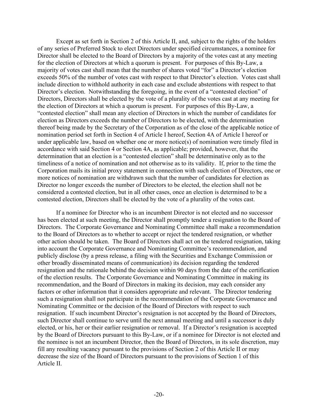 -20- Except as set forth in Section 2 of this Article II, and, subject to the rights of the holders of any series of Preferred Stock to elect Directors under specified circumstances, a nominee for Director shall be elected to the Board of Directors by a majority of the votes cast at any meeting for the election of Directors at which a quorum is present. For purposes of this By-Law, a majority of votes cast shall mean that the number of shares voted “for” a Director’s election exceeds 50% of the number of votes cast with respect to that Director’s election. Votes cast shall include direction to withhold authority in each case and exclude abstentions with respect to that Director’s election. Notwithstanding the foregoing, in the event of a “contested election” of Directors, Directors shall be elected by the vote of a plurality of the votes cast at any meeting for the election of Directors at which a quorum is present. For purposes of this By-Law, a “contested election” shall mean any election of Directors in which the number of candidates for election as Directors exceeds the number of Directors to be elected, with the determination thereof being made by the Secretary of the Corporation as of the close of the applicable notice of nomination period set forth in Section 4 of Article I hereof, Section 4A of Article I hereof or under applicable law, based on whether one or more notice(s) of nomination were timely filed in accordance with said Section 4 or Section 4A, as applicable; provided, however, that the determination that an election is a “contested election” shall be determinative only as to the timeliness of a notice of nomination and not otherwise as to its validity. If, prior to the time the Corporation mails its initial proxy statement in connection with such election of Directors, one or more notices of nomination are withdrawn such that the number of candidates for election as Director no longer exceeds the number of Directors to be elected, the election shall not be considered a contested election, but in all other cases, once an election is determined to be a contested election, Directors shall be elected by the vote of a plurality of the votes cast. If a nominee for Director who is an incumbent Director is not elected and no successor has been elected at such meeting, the Director shall promptly tender a resignation to the Board of Directors. The Corporate Governance and Nominating Committee shall make a recommendation to the Board of Directors as to whether to accept or reject the tendered resignation, or whether other action should be taken. The Board of Directors shall act on the tendered resignation, taking into account the Corporate Governance and Nominating Committee’s recommendation, and publicly disclose (by a press release, a filing with the Securities and Exchange Commission or other broadly disseminated means of communication) its decision regarding the tendered resignation and the rationale behind the decision within 90 days from the date of the certification of the election results. The Corporate Governance and Nominating Committee in making its recommendation, and the Board of Directors in making its decision, may each consider any factors or other information that it considers appropriate and relevant. The Director tendering such a resignation shall not participate in the recommendation of the Corporate Governance and Nominating Committee or the decision of the Board of Directors with respect to such resignation. If such incumbent Director’s resignation is not accepted by the Board of Directors, such Director shall continue to serve until the next annual meeting and until a successor is duly elected, or his, her or their earlier resignation or removal. If a Director’s resignation is accepted by the Board of Directors pursuant to this By-Law, or if a nominee for Director is not elected and the nominee is not an incumbent Director, then the Board of Directors, in its sole discretion, may fill any resulting vacancy pursuant to the provisions of Section 2 of this Article II or may decrease the size of the Board of Directors pursuant to the provisions of Section 1 of this Article II.