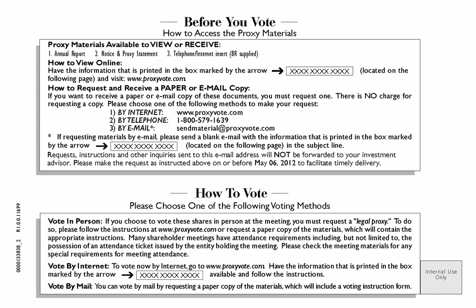 How To Vote Please Choose One of the Following Voting Methods Internal Use Only Before You Vote How to Access the Proxy Materials Proxy Materials Available to VIEW or RECEIVE: How to View Online: Have the information that is printed in the box marked by the arrow (located on the following page) and visit: www.proxyvote.com. How to Request and Receive a PAPER or E-MAIL Copy: If you want to receive a paper or e-mail copy of these documents, you must request one. There is NO charge for requesting a copy. Please choose one of the following methods to make your request: 1) BY INTERNET: www.proxyvote.com 2) BY TELEPHONE: 1-800-579-1639 3) BY E-MAIL*: sendmaterial@proxyvote.com * If requesting materials by e-mail, please send a blank e-mail with the information that is printed in the box marked by the arrow (located on the following page) in the subject line. XXXX XXXX XXXX XXXX XXXX XXXX Vote In Person: If you choose to vote these shares in person at the meeting, you must request a "legal proxy." To do so, please follow the instructions at www.proxyvote.com or request a paper copy of the materials, which will contain the appropriate instructions. Many shareholder meetings have attendance requirements including, but not limited to, the possession of an attendance ticket issued by the entity holding the meeting. Please check the meeting materials for any special requirements for meeting attendance. Vote By Internet: To vote now by Internet, go to www.proxyvote.com. Have the information that is printed in the box marked by the arrow available and follow the instructions. Vote By Mail: You can vote by mail by requesting a paper copy of the materials, which will include a voting instruction form. . XXXX XXXX XXXX 0000133838_2 R1.0.0.11699 1. Annual Report 2. Notice & Proxy Statement 3. Telephone/Internet insert (BR supplied) Requests, instructions and other inquiries sent to this e-mail address will NOT be forwarded to your investment advisor. Please make the request as instructed above on or before May 06, 2012 to facilitate timely delivery. |
