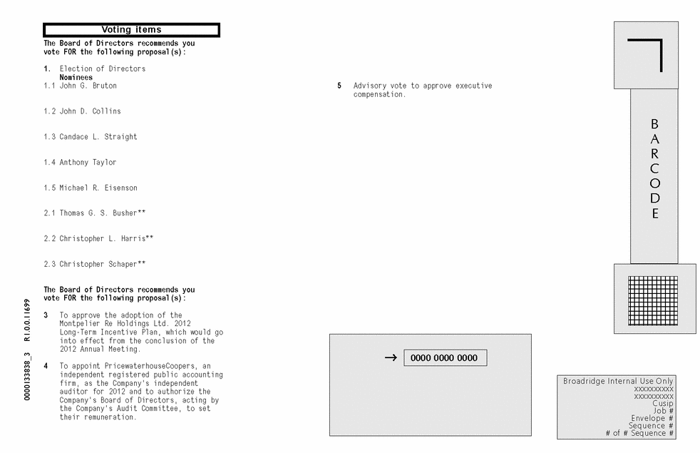 BARCODE Broadridge Internal Use Only xxxxxxxxxx xxxxxxxxxx Cusip Job # Envelope # Sequence # # of # Sequence # 0000 0000 0000 . Voting items 0000133838_3 R1.0.0.11699 The Board of Directors recommends you vote FOR the following proposal(s): 1. Election of Directors Nominees 1.1 John G. Bruton 1.2 John D. Collins 1.3 Candace L. Straight 1.4 Anthony Taylor 1.5 Michael R. Eisenson 2.1 Thomas G. S. Busher** 2.2 Christopher L. Harris** 2.3 Christopher Schaper** The Board of Directors recommends you vote FOR the following proposal(s): 3 To approve the adoption of the Montpelier Re Holdings Ltd. 2012 Long-Term Incentive Plan, which would go into effect from the conclusion of the 2012 Annual Meeting. 4 To appoint PricewaterhouseCoopers, an independent registered public accounting firm, as the Company's independent auditor for 2012 and to authorize the Company's Board of Directors, acting by the Company's Audit Committee, to set their remuneration. 5 Advisory vote to approve executive compensation. |