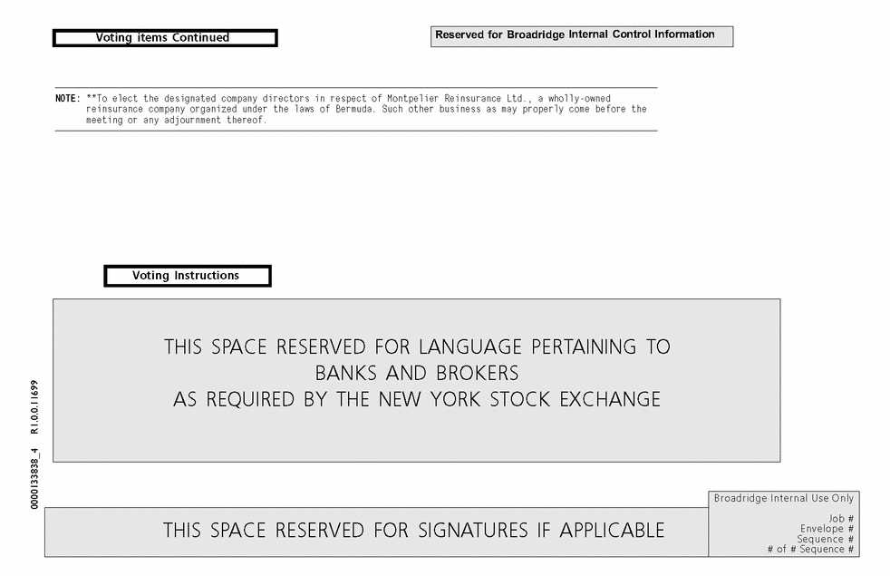 THIS SPACE RESERVED FOR LANGUAGE PERTAINING TO BANKS AND BROKERS AS REQUIRED BY THE NEW YORK STOCK EXCHANGE Voting Instructions THIS SPACE RESERVED FOR SIGNATURES IF APPLICABLE Broadridge Internal Use Only Job # Envelope # Sequence # # of # Sequence # Reserved for Broadridge Internal Control Information Voting items Continued 0000133838_4 R1.0.0.11699 NOTE: **To elect the designated company directors in respect of Montpelier Reinsurance Ltd., a wholly-owned reinsurance company organized under the laws of Bermuda. Such other business as may properly come before the meeting or any adjournment thereof. |