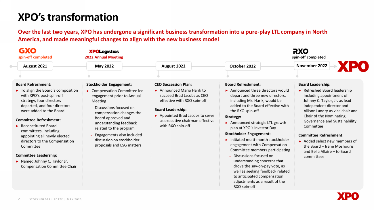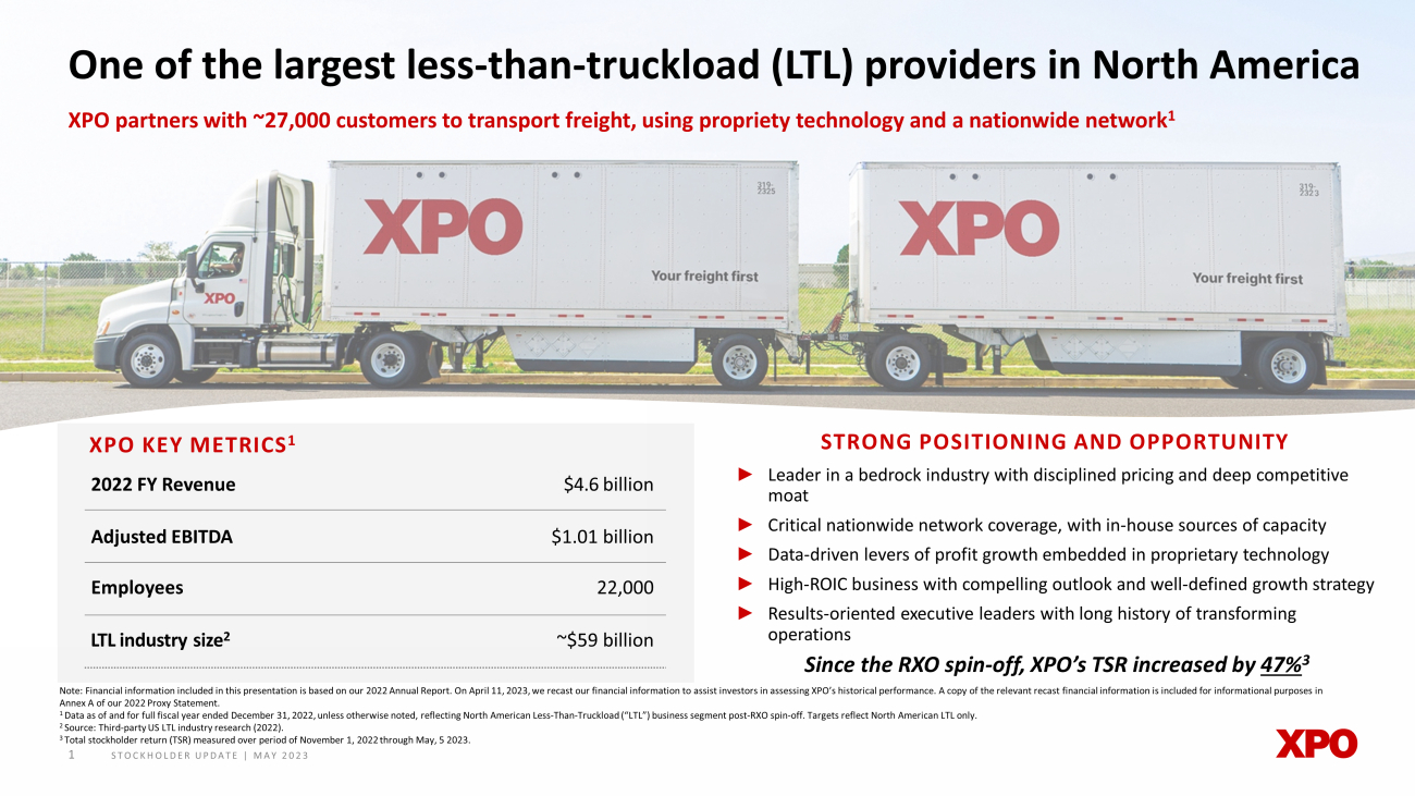 STOCKHOLDER UPDATE | MAY 2023 One of the largest less - than - truckload (LTL) providers in North America XPO partners with ~27,000 customers to transport freight, using propriety technology and a nationwide network 1 XPO KEY METRICS 1 2022 FY R evenue $ 4.6 billion Adjusted EBITDA $1.01 billion Employees 22 ,000 LTL industry size 2 ~$59 billion STRONG POSITIONING AND OPPORTUNITY Note: Financial information included in this presentation is based on our 2022 Annual Report. On April 11, 2023, we recast ou r f inancial information to assist investors in assessing XPO’s historical performance. A copy of the relevant recast financial i nfo rmation is included for informational purposes in Annex A of our 2022 Proxy Statement. 1 Data as of and for full fiscal year ended December 31, 2022, unless otherwise noted, reflecting North American Less - Than - Trucklo ad (“LTL”) business segment post - RXO spin - off. Targets reflect North American LTL only. 2 Source: Third - party US LTL industry research (2022). 3 Total stockholder return (TSR) measured over period of November 1, 2022 through May, 5 2023. 1 ► Leader in a bedrock industry with disciplined pricing and deep competitive moat ► Critical nationwide network coverage, with in - house sources of capacity ► Data - driven levers of profit growth embedded in proprietary technology ► High - ROIC business with compelling outlook and well - defined growth strategy ► Results - oriented executive leaders with long history of transforming operations Since the RXO spin - off, XPO’s TSR increased by 47% 3