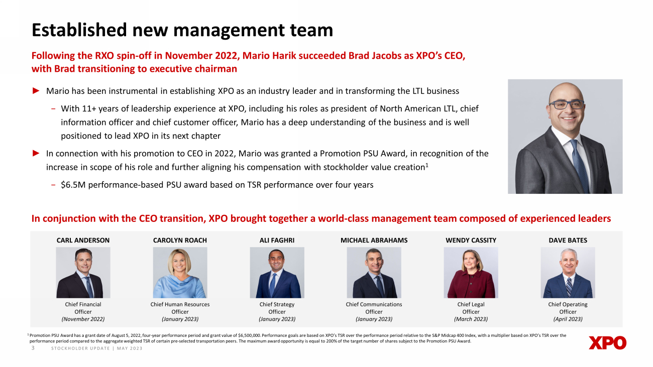 STOCKHOLDER UPDATE | MAY 2023 3 Established new management team Following the RXO spin - off in November 2022, Mario Harik succeeded Brad Jacobs as XPO’s CEO, with Brad transitioning to executive chairman ► Mario has been instrumental in establishing XPO as an industry leader and in transforming the LTL business − With 11+ years of leadership experience at XPO, including his roles as president of North American LTL, chief information officer and chief customer officer, Mario has a deep understanding of the business and is well positioned to lead XPO in its next chapter ► In connection with his promotion to CEO in 2022, Mario was granted a Promotion PSU Award, in recognition of the increase in scope of his role and further aligning his compensation with stockholder value creation 1 − $6.5M performance - based PSU award based on TSR performance over four years In conjunction with the CEO transition, XPO brought together a world - class management team composed of experienced leaders 1 Promotion PSU Award has a grant date of August 5, 2022, four - year performance period and grant value of $6,500,000. Performance goals are based on XPO’s TSR over the performance period relative to the S&P Midcap 400 Index, with a multiplier based on XPO ’s TSR over the performance period compared to the aggregate weighted TSR of certain pre - selected transportation peers. The maximum award opport unity is equal to 200% of the target number of shares subject to the Promotion PSU Award. CARL ANDERSON Chief Financial Officer (November 2022) CAROLYN ROACH Chief Human Resources Officer (January 2023) ALI FAGHRI Chief Strategy Officer (January 2023) MICHAEL ABRAHAMS Chief Communications Officer (January 2023) WENDY CASSITY Chief Legal Officer (March 2023) DAVE BATES Chief Operating Officer (April 2023)
