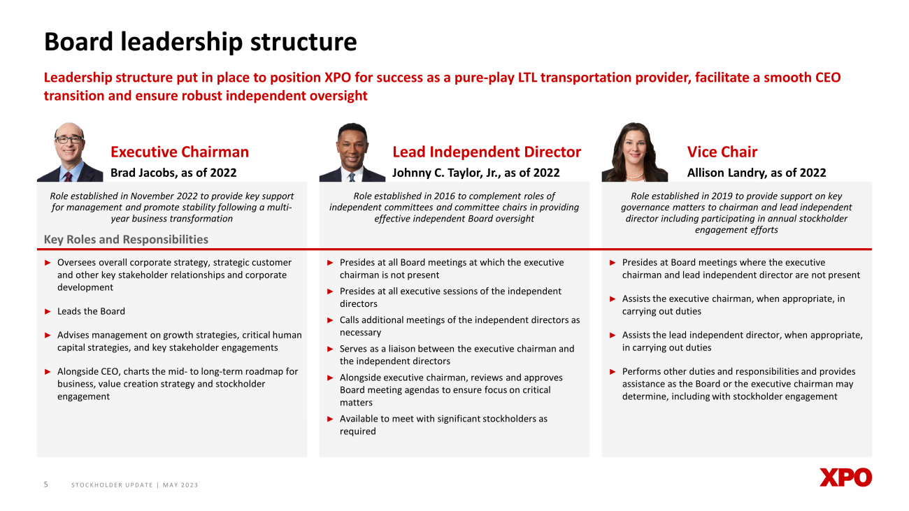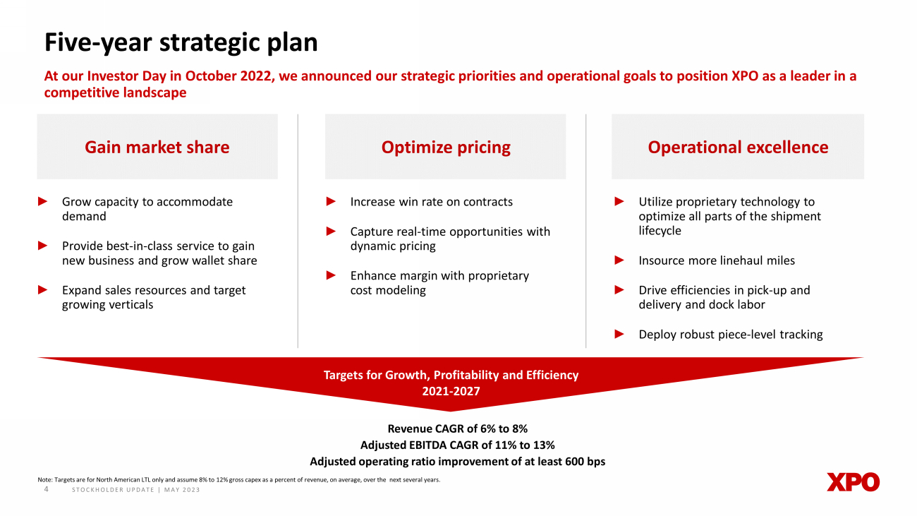 STOCKHOLDER UPDATE | MAY 2023 4 Five - year strategic plan Targets for Growth, Profitability and Efficiency 2021 - 2027 Revenue CAGR of 6% to 8% Adjusted EBITDA CAGR of 11% to 13% Adjusted operating ratio improvement of at least 600 bps At our Investor Day in October 2022, we announced our strategic priorities and operational goals to position XPO as a leader in a competitive landscape Gain market share ► Grow capacity to accommodate demand ► Provide best - in - class service to gain new business and grow wallet share ► Expand sales resources and target growing verticals Optimize pricing ► Increase win rate on contracts ► Capture real - time opportunities with dynamic pricing ► Enhance margin with proprietary cost modeling Operational excellence ► Utilize proprietary technology to optimize all parts of the shipment lifecycle ► Insource more linehaul miles ► Drive efficiencies in pick - up and delivery and dock labor ► Deploy robust piece - level tracking Note: Targets are for North American LTL only and assume 8% to 12% gross capex as a percent of revenue, on average, over the ne xt several years. 4