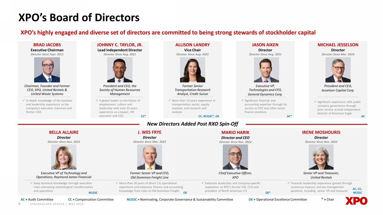 STOCKHOLDER UPDATE | MAY 2023 5 Leadership structure put in place to position XPO for success as a pure - play LTL transportation provider, facilitate a smooth CE O transition and ensure robust independent oversight Board leadership structure ► Oversees overall corporate strategy, strategic customer and other key stakeholder relationships and corporate development ► Leads the Board ► Advises management on growth strategies, critical human capital strategies, and key stakeholder engagements ► Alongside CEO, charts the mid - to long - term roadmap for business, value creation strategy and stockholder engagement Executive Chairman Brad Jacobs, as of 2022 Role established in November 2022 to provide key support for management and promote stability following a multi - year business transformation Role established in 2019 to provide support on key governance matters to chairman and lead independent director including participating in annual stockholder engagement efforts Key Roles and Responsibilities Role established in 2016 to complement roles of independent committees and committee chairs in providing effective independent Board oversight Lead Independent Director Johnny C. Taylor, Jr., as of 2022 Vice Chair Allison Landry, as of 2022 ► Presides at all Board meetings at which the executive chairman is not present ► Presides at all executive sessions of the independent directors ► Calls additional meetings of the independent directors as necessary ► Serves as a liaison between the executive chairman and the independent directors ► Alongside executive chairman, reviews and approves Board meeting agendas to ensure focus on critical matters ► Available to meet with significant stockholders as required ► Presides at Board meetings where the executive chairman and lead independent director are not present ► Assists the executive chairman, when appropriate, in carrying out duties ► Assists the lead independent director, when appropriate, in carrying out duties ► Performs other duties and responsibilities and provides assistance as the Board or the executive chairman may determine, including with stockholder engagement