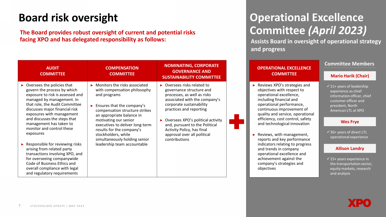 STOCKHOLDER UPDATE | MAY 2023 6 XPO’s highly engaged and diverse set of directors are committed to being strong stewards of stockholder capital XPO’s Board of Directors BRAD JACOBS Executive Chairman Director Since Sept. 2011 Chairman, Founder and Former CEO, XPO, United Rentals & United Waste Systems x In - depth knowledge of the business and leadership experience as the company’s executive chairman and former CEO JOHNNY C. TAYLOR, JR. Lead Independent Director Director Since Aug. 2021 President and CEO, the Society of Human Resources Management x A global leader on the future of employment, culture and leadership with over 25 years experience as a lawyer, HR executive and CEO CC* ALLISON LANDRY Vice Chair Director Since Aug. 2021 Former Senior Transportation Research Analyst, Credit Suisse CC, NCGSC*, OE x More than 15 years experience in transportation sector, equity markets, and research and analysis JASON AIKEN Director Director Since Aug. 2021 AC* Executive VP, Technologies and CFO, General Dynamics Corp. x Significant financial and accounting expertise through his service as CFO and other senior finance positions MICHAEL JESSELSON Director Director Since Mar. 2016 President and CEO, Jesselson Capital Corp. x Significant experience with public company governance through prior service as lead independent director of American Eagle AC = Audit Committee NCGSC = Nominating, Corporate Governance & Sustainability Committee CC = Compensation Committee * = Chair AC x Deep technical knowledge through executive roles overseeing technological transformation and operations BELLA ALLAIRE Director Director Since Nov. 2023 Executive VP of Technology and Operations, Raymond James Financial NCGSC J. WES FRYE Director Director Since Mar. 2023 Former Senior VP and CFO, Old Dominion Freight Line x More than 30 years of direct LTL operational experience and extensive finance and accounting knowledge from roles at Old Dominion Freight OE x Extensive leadership and company - specific experience as XPO’s former CIO, CCO and president of North American LTL MARIO HARIK Director and CEO Director Since Nov. 2022 Chief Executive Officer, XPO OE* x Financial leadership experience gained through numerous treasury and tax management positions, including senior VP and treasurer IRENE MOSHOURIS Director Director Since Nov. 2022 Senior VP and Treasurer, United Rentals AC, CC, NCGSC OE = Operational Excellence Committee New Directors Added Post RXO Spin - Off