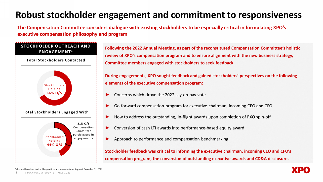 STOCKHOLDER UPDATE | MAY 2023 Board risk oversight 7 The Board provides robust oversight of current and potential risks facing XPO and has delegated responsibility as follows: AUDIT COMMITTEE COMPENSATION COMMITTEE NOMINATING, CORPORATE GOVERNANCE AND SUSTAINABILITY COMMITTEE ► Oversees the policies that govern the process by which exposure to risk is assessed and managed by management. In that role, the Audit Committee discusses major financial risk exposures with management and discusses the steps that management has taken to monitor and control these exposures ► Responsible for reviewing risks arising from related party transactions involving XPO, and for overseeing companywide Code of Business Ethics and overall compliance with legal and regulatory requirements ► Monitors the risks associated with compensation philosophy and programs ► Ensures that the company’s compensation structure strikes an appropriate balance in motivating our senior executives to deliver long - term results for the company’s stockholders, while simultaneously holding senior leadership team accountable ► Oversees risks related to governance structure and processes, as well as risks associated with the company’s corporate sustainability practices and reporting ► Oversees XPO’s political activity and, pursuant to the Political Activity Policy, has final approval over all political contributions OPERATIONAL EXCELLENCE COMMITTEE ► Reviews XPO’s strategies and objectives with respect to operational excellence, including financial and operational performance, continuous improvement of quality and service, operational efficiency, cost control, safety and technological innovation ► Reviews, with management, reports and key performance indicators relating to progress and trends in company operational excellence and achievement against the company’s strategies and objectives Operational Excellence Committee (April 2023) Committee Members Wes Frye x 30+ years of direct LTL operational experience Allison Landry x 15+ years experience in the transportation sector, equity markets, research and analysis Mario Harik (Chair) x 11+ years of leadership experience as chief information officer, chief customer officer and president, North American LTL at XPO Assists Board in oversight of operational strategy and progress