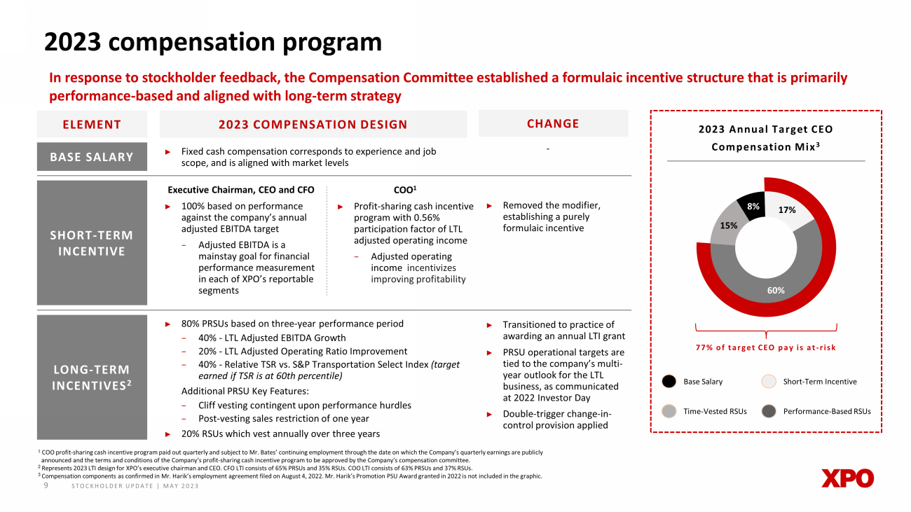 STOCKHOLDER UPDATE | MAY 2023 8 Robust stockholder engagement and commitment to responsiveness 1 Calculated based on stockholder positions and shares outstanding as of December 31, 2022. Following the 2022 Annual Meeting, as part of the reconstituted Compensation Committee’s holistic review of XPO’s compensation program and to ensure alignment with the new business strategy, Committee members engaged with stockholders to seek feedback During engagements, XPO sought feedback and gained stockholders’ perspectives on the following elements of the executive compensation program: ► Concerns which drove the 2022 say - on - pay vote ► Go - forward compensation program for executive chairman, incoming CEO and CFO ► How to address the outstanding, in - flight awards upon completion of RXO spin - off ► Conversion of cash LTI awards into performance - based equity award ► Approach to performance and compensation benchmarking Stockholder feedback was critical to informing the executive chairman, incoming CEO and CFO’s compensation program, the conversion of outstanding executive awards and CD&A disclosures The Compensation Committee considers dialogue with existing stockholders to be especially critical in formulating XPO’s executive compensation philosophy and program STOCKHOLDER OUTREACH AND ENGAGEMENT 1 Stockholders Holding 66% O/S Total Stockholders Engaged With Total Stockholders Contacted Stockholders Holding 44% O/S 31% O/S Compensation Committee participated in engagements