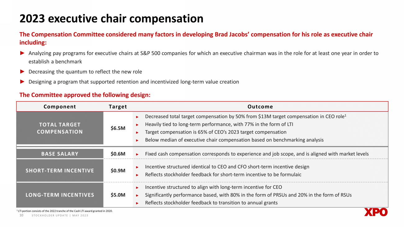 STOCKHOLDER UPDATE | MAY 2023 9 In response to stockholder feedback, the Compensation Committee established a formulaic incentive structure that is primarily performance - based and aligned with long - term strategy 2023 compensation program 1 COO profit - sharing cash incentive program paid out quarterly and subject to Mr. Bates’ continuing employment through the date o n which the Company’s quarterly earnings are publicly announced and the terms and conditions of the Company’s profit - sharing cash incentive program to be approved by the Company’s co mpensation committee. 2 Represents 2023 LTI design for XPO’s executive chairman and CEO. CFO LTI consists of 65% PRSUs and 35% RSUs. COO LTI consists of 63% PRSUs and 37% RSUs. 3 Compensation components as confirmed in Mr. Harik’s employment agreement filed on August 4, 2022. Mr. Harik’s Promotion PSU Award granted in 2022 is not included in the graphic. BASE SALARY SHORT - TERM INCENTIVE LONG - TERM INCENTIVES 2 ELEMENT 2023 COMPENSATION DESIGN ► Fixed cash compensation corresponds to experience and job scope, and is aligned with market levels Executive Chairman, CEO and CFO ► 100% based on performance against the company’s annual adjusted EBITDA target − Adjusted EBITDA is a mainstay goal for financial performance measurement in each of XPO’s reportable segments ► 80% PRSUs based on three - year performance period − 40% - LTL Adjusted EBITDA Growth − 20% - LTL Adjusted Operating Ratio Improvement − 40% - Relative TSR vs. S&P Transportation Select Index (target earned if TSR is at 60th percentile) Additional PRSU Key Features: − Cliff vesting contingent upon performance hurdles − Post - vesting sales restriction of one year ► 20% RSUs which vest annually over three years 8% 17% 60% 15% 2023 Annual Target CEO Compensation Mix 3 Base Salary Short - Term Incentive Performance - Based RSUs Time - Vested RSUs 77% of target CEO pay is at - risk CHANGE - ► Removed the modifier, establishing a purely formulaic incentive ► Transitioned to practice of awarding an annual LTI grant ► PRSU operational targets are tied to the company’s multi - year outlook for the LTL business, as communicated at 2022 Investor Day ► Double - trigger change - in - control provision applied COO 1 ► Profit - sharing cash incentive program with 0.56% participation factor of LTL adjusted operating income − Adjusted operating income incentivizes improving profitability