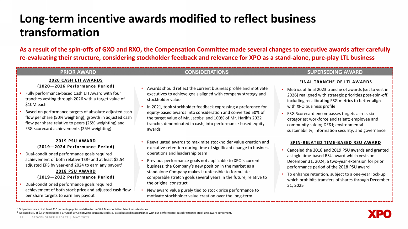 STOCKHOLDER UPDATE | MAY 2023 PRIOR AWARD CONSIDERATIONS SUPERSEDING AWARD 2020 CASH LTI AWARDS (2020 — 2026 Performance Period) • Fully performance - based Cash LTI Award with four tranches vesting through 2026 with a target value of $10M each • Based on performance targets of absolute adjusted cash flow per share (50% weighting), growth in adjusted cash flow per share relative to peers (25% weighting) and ESG scorecard achievements (25% weighting) • Awards should reflect the current business profile and motivate executives to achieve goals aligned with company strategy and stockholder value • In 2021, took stockholder feedback expressing a preference for equity - based awards into consideration and converted 50% of the target value of Mr. Jacobs’ and 100% of Mr. Harik’s 2022 tranche, denominated in cash, into performance - based equity awards FINAL TRANCHE OF LTI AWARDS • Metrics of final 2023 tranche of awards (set to vest in 2026) realigned with strategic priorities post - spin - off, including recalibrating ESG metrics to better align with XPO business profile • ESG Scorecard encompasses targets across six categories: workforce and talent; employee and community safety; DE&I; environmental sustainability; information security; and governance 2019 PSU AWARD (2019 — 2024 Performance Period) • Dual - conditioned performance goals required achievement of both relative TSR 1 and at least $2.54 adjusted EPS by year - end 2024 to earn any payout 2 2018 PSU AWARD (2019 — 2022 Performance Period) • Dual - conditioned performance goals required achievement of both stock price and adjusted cash flow per share targets to earn any payout • Reevaluated awards to maximize stockholder value creation and executive retention during time of significant change to business operations and leadership team • Previous performance goals not applicable to XPO’s current business; the Company’s new position in the market as a standalone Company makes it unfeasible to formulate comparable stretch goals several years in the future, relative to the original construct • New award value purely tied to stock price performance to motivate stockholder value creation over the long - term SPIN - RELATED TIME - BASED RSU AWARD • Canceled the 2018 and 2019 PSU awards and granted a single time - based RSU award which vests on December 31, 2024, a two - year extension for prior performance period of the 2018 PSU award • To enhance retention, subject to a one - year lock - up which prohibits transfers of shares through December 31, 2025 As a result of the spin - offs of GXO and RXO, the Compensation Committee made several changes to executive awards after carefully re - evaluating their structure, considering stockholder feedback and relevance for XPO as a stand - alone, pure - play LTL business 11 Long - term incentive awards modified to reflect business transformation 1 Outperformance of at least 310 percentage points relative to the S&P Transportation Select Industry index. 2 Adjusted EPS of $2.54 represents a CAGR of 19% relative to 2018 adjusted EPS, as calculated in accordance with our performanc e - b ased restricted stock unit award agreement.
