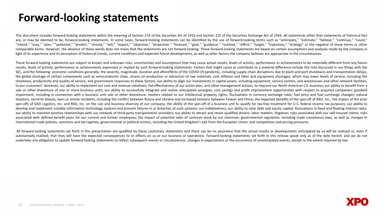 STOCKHOLDER UPDATE | MAY 2023 12 12 Forward - looking statements This document includes forward - looking statements within the meaning of Section 27 A of the Securities Act of 1933 and Section 21 E of the Securities Exchange Act of 1934 . All statements other than statements of historical fact are, or may be deemed to be, forward - looking statements . In some cases, forward - looking statements can be identified by the use of forward - looking terms such as “anticipate,” “estimate,” “believe,” “continue,” “could,” “intend,” “may,” “plan,” “potential,” “predict,” “should,” “will,” “expect,” “objective,” “projection,” “forecast,” “goal,” “guidance,” “outlook,” “effort,” “target,” “trajectory,” "strategy" or the negative of these terms or other comparable terms . However, the absence of these words does not mean that the statements are not forward - looking . These forward - looking statements are based on certain assumptions and analyses made by the company in light of its experience and its perception of historical trends, current conditions and expected future developments, as well as other factors the company believes are appropriate in the circumstances . These forward - looking statements are subject to known and unknown risks, uncertainties and assumptions that may cause actual results, levels of activity, performance or achievements to be materially different from any future results, levels of activity, performance or achievements expressed or implied by such forward - looking statements . Factors that might cause or contribute to a material difference include the risks discussed in our filings with the SEC, and the following : economic conditions generally ; the severity, magnitude, duration and aftereffects of the COVID - 19 pandemic, including supply chain disruptions due to plant and port shutdowns and transportation delays, the global shortage of certain components such as semiconductor chips, strains on production or extraction of raw materials, cost inflation and labor and equipment shortages, which may lower levels of service, including the timeliness, productivity and quality of service, and government responses to these factors ; our ability to align our investments in capital assets, including equipment, service centers, and warehouses and other network facilities, to our customers’ demands ; our ability to implement our cost and revenue initiatives ; the effectiveness of our action plan, and other management actions, to improve our North American LTL business ; our ability to benefit from a sale or other divestiture of one or more business units ; our ability to successfully integrate and realize anticipated synergies, cost savings and profit improvement opportunities with respect to acquired companies ; goodwill impairment, including in connection with a business unit sale or other divestiture ; matters related to our intellectual property rights ; fluctuations in currency exchange rates ; fuel price and fuel surcharge changes ; natural disasters, terrorist attacks, wars or similar incidents, including the conflict between Russia and Ukraine and increased tensions between Taiwan and China ; the expected benefits of the spin - off of RXO, Inc .; the impact of the prior spin - offs of GXO Logistics, Inc . and RXO, Inc . on the size and business diversity of our company ; the ability of the spin - off of a business unit to qualify for tax - free treatment for U . S . federal income tax purposes ; our ability to develop and implement suitable information technology systems and prevent failures in or breaches of such systems ; our indebtedness ; our ability to raise debt and equity capital ; fluctuations in fixed and floating interest rates ; our ability to maintain positive relationships with our network of third - party transportation providers ; our ability to attract and retain qualified drivers ; labor matters ; litigation ; risks associated with our self - insured claims ; risks associated with defined benefit plans for our current and former employees ; the impact of potential sales of common stock by our chairman ; governmental regulation, including trade compliance laws, as well as changes in international trade policies, sanctions and tax regimes ; governmental or political actions, including the United Kingdom’s exit from the European Union ; and competition and pricing pressures . All forward - looking statements set forth in this presentation are qualified by these cautionary statements and there can be no assurance that the actual results or developments anticipated by us will be realized or, even if substantially realized, that they will have the expected consequences to or effects on us or our business or operations . Forward - looking statements set forth in this release speak only as of the date hereof, and we do not undertake any obligation to update forward - looking statements to reflect subsequent events or circumstances, changes in expectations or the occurrence of unanticipated events, except to the extent required by law .