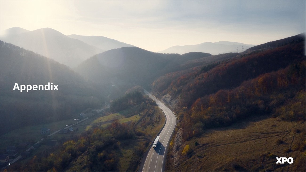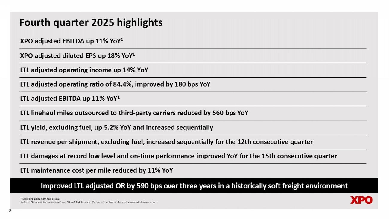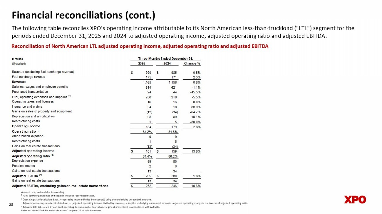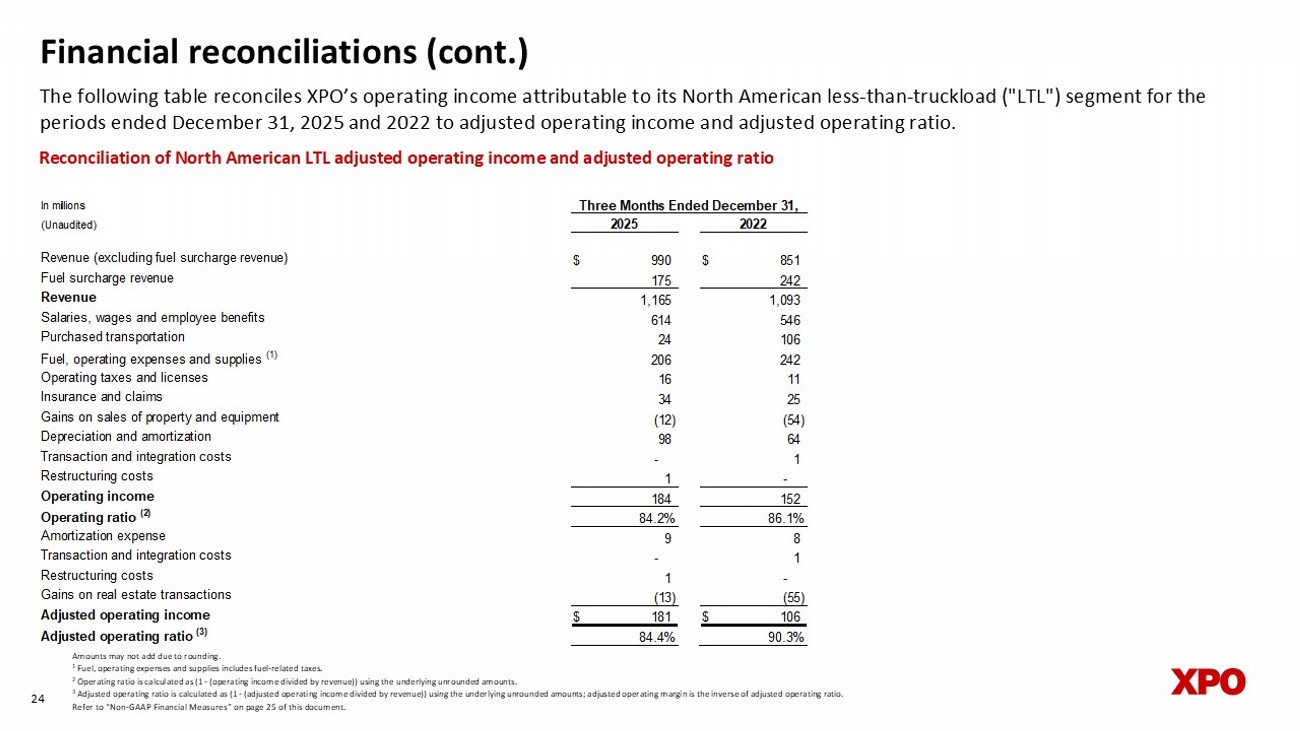 Financial reconciliations (cont.) The following table reconciles XPO’s operating income attributable to its North American less - than - truckload ("LTL") segment for the periods ended December 31, 2025 and 2024 to adjusted operating income, adjusted operating ratio and adjusted EBITDA. 23 Reconciliation of North American LTL adjusted operating income, adjusted operating ratio and adjusted EBITDA In millions (Unaudited) Change % Revenue (excluding fuel surcharge revenue) $ 990 $ 985 0.5% Fuel surcharge revenue 175 171 2.3% Revenue 1,165 1,156 0.8% Salaries, wages and employee benefits 614 621 -1.1% Purchased transportation 24 44 -45.5% Fuel, operating expenses and supplies (1) 206 218 -5.5% Operating taxes and licenses 16 16 0.0% Insurance and claims 34 18 88.9% Gains on sales of property and equipment (12) (34) -64.7% Depreciation and amortization 98 89 10.1% Restructuring costs 1 5 -80.0% Operating income 184 179 2.8% Operating ratio (2) 84.2% 84.5% Amortization expense 9 9 Restructuring costs 1 5 Gains on real estate transactions (13) (34) Adjusted operating income $ 181 $ 159 13.8% Adjusted operating ratio (3) 84.4% 86.2% Depreciation expense 89 80 Pension income 2 6 Gains on real estate transactions 13 34 Adjusted EBITDA (4) $ 285 $ 280 1.8% Gains on real estate transactions 13 34 Adjusted EBITDA, excluding gains on real estate transactions $ 272 246 10.6% 2025 2024 Three Months Ended December 31, Amounts may not add due to rounding. 1 Fuel, operating expenses and supplies includes fuel - related taxes. 2 Operating ratio is calculated as (1 - (operating income divided by revenue)) using the underlying unrounded amounts. 3 Adjusted operating ratio is calculated as (1 - (adjusted operating income divided by revenue)) using the underlying unrounded am ounts; adjusted operating margin is the inverse of adjusted operating ratio. 4 Adjusted EBITDA is used by our chief operating decision maker to evaluate segment profit (loss) in accordance with ASC 280. Refer to “Non - GAAP Financial Measures” on page 25 of this document.
