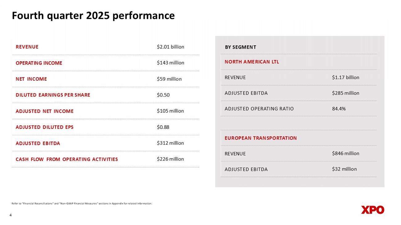 Fourth quarter 2025 highlights XPO adjusted EBITDA up 11% YoY 1 XPO adjusted diluted EPS up 18% YoY 1 LTL adjusted operating income up 14% YoY LTL adjusted operating ratio of 84.4%, improved by 180 bps YoY LTL adjusted EBITDA up 11% YoY 1 LTL linehaul miles outsourced to third - party carriers reduced by 560 bps YoY LTL yield, excluding fuel, up 5.2% YoY and increased sequentially LTL revenue per shipment, excluding fuel, increased sequentially for the 12th consecutive quarter LTL damages at record low level and on - time performance improved YoY for the 15th consecutive quarter LTL maintenance cost per mile reduced by 11% YoY Improved LTL adjusted OR by 590 bps over three years in a historically soft freight environment 1 Excluding gains from real estate. Refer to “Financial Reconciliations” and “Non - GAAP Financial Measures” sections in Appendix for related information. 3