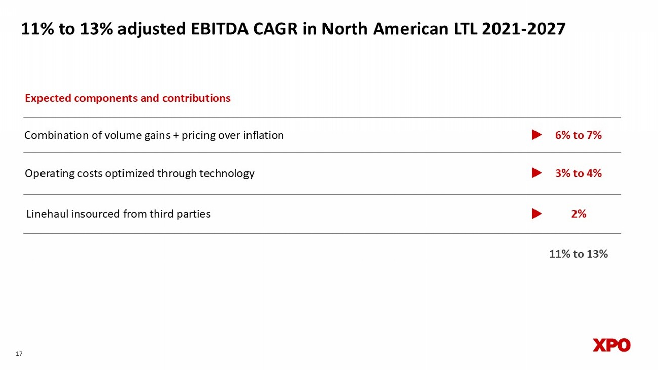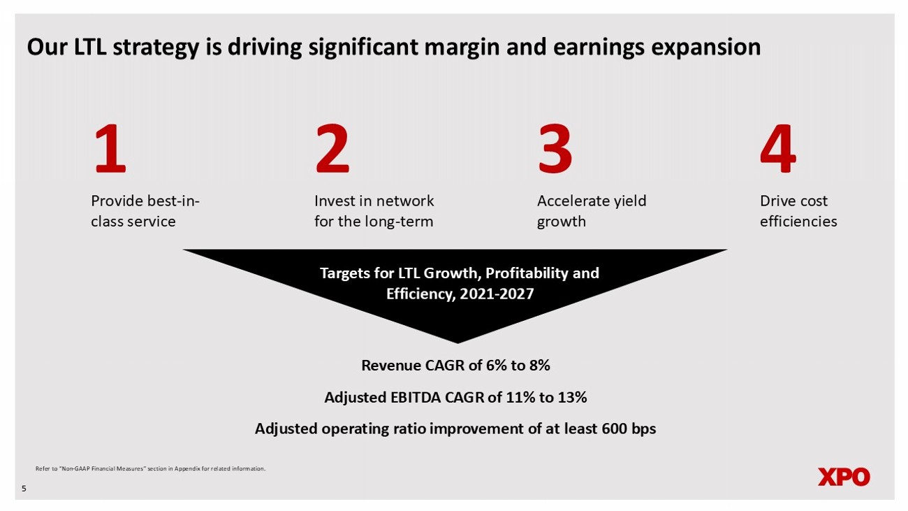 Non - GAAP financial measures As required by the rules of the Securities and Exchange Commission (“SEC”), we provide reconciliations of the non - GAAP financial measures contained in this document to the most directly comparable measures under GAAP, which are set forth in the financial tables attached to this document . This document contains the following non - GAAP financial measures : adjusted earnings before interest, taxes, depreciation and amortization (“adjusted EBITDA”) on a consolidated basis ; adjusted EBITDA, excluding gains on real estate transactions on a consolidated basis and for our North American Less - Than - Truckload segment ; adjusted net income ; adjusted diluted earnings per share ("adjusted EPS") ; adjusted EPS, excluding gains on real estate transactions ; adjusted operating income for our North American Less - Than - Truckload segment ; adjusted operating ratio for our North American Less - Than - Truckload segment ; and adjusted effective tax rate . We believe that the above adjusted financial measures facilitate analysis of our ongoing business operations because they exclude items that may not be reflective of, or are unrelated to, XPO and its business segments’ core operating performance, and may assist investors with comparisons to prior periods and assessing trends in our underlying businesses . Other companies may calculate these non - GAAP financial measures differently, and therefore our measures may not be comparable to similarly titled measures of other companies . These non - GAAP financial measures should only be used as supplemental measures of our operating performance . Adjusted EBITDA, adjusted EBITDA, excluding gains on real estate transactions, adjusted net income, adjusted EPS, adjusted EPS, excluding gains on real estate transactions, adjusted operating income and adjusted operating ratio include adjustments for transaction and integration costs, as well as restructuring costs, and other adjustments as set forth in the attached tables . Transaction and integration adjustments are generally incremental costs that result from an actual or planned acquisition, divestiture or spin - off and may include transaction costs, consulting fees, stock - based compensation, retention awards, internal salaries and wages (to the extent the individuals are assigned full - time to integration and transformation activities) and certain costs related to integrating and converging IT systems . Restructuring costs primarily relate to severance costs associated with business optimization initiatives . Management uses these non - GAAP financial measures in making financial, operating and planning decisions and evaluating XPO’s and each business segment’s ongoing performance . We believe that adjusted EBITDA and adjusted EBITDA, excluding gains on real estate transactions improve comparability from period to period by removing the impact of our capital structure (interest and financing expenses), asset base (depreciation and amortization), tax impacts and other adjustments as set out in the attached tables that management has determined are not reflective of core operating activities and thereby assist investors with assessing trends in our underlying businesses . We believe that adjusted net income, adjusted EPS and adjusted EPS, excluding gains on real estate transactions improve the comparability of our operating results from period to period by removing the impact of certain costs and gains that management has determined are not reflective of our core operating activities, including amortization of acquisition - related intangible assets, transaction and integration costs, restructuring costs and other adjustments as set out in the attached tables . We believe that adjusted operating income and adjusted operating ratio improve the comparability of our operating results from period to period by removing the impact of certain transaction and integration costs and restructuring costs, as well as amortization expense and other adjustments as set out in the attached tables . We believe that adjusted effective tax rate improves comparability of our effective tax rate, by excluding the tax effect of special items . With respect to our targets for : ( i ) the North American less - than - truckload segment’s adjusted EBITDA CAGR and adjusted operating ratio for the six - year period 2021 through 2027 and (ii) the 2026 adjusted effective tax rate, a reconciliation of these non - GAAP measures to the corresponding GAAP measures is not available without unreasonable effort due to the variability and complexity of the reconciling items described above that we exclude from these non - GAAP target measures . The variability of these items may have a significant impact on our future GAAP financial results and, as a result, we are unable to prepare the forward - looking statement of income and statement of cash flows in accordance with GAAP that would be required to produce such a reconciliation . 25