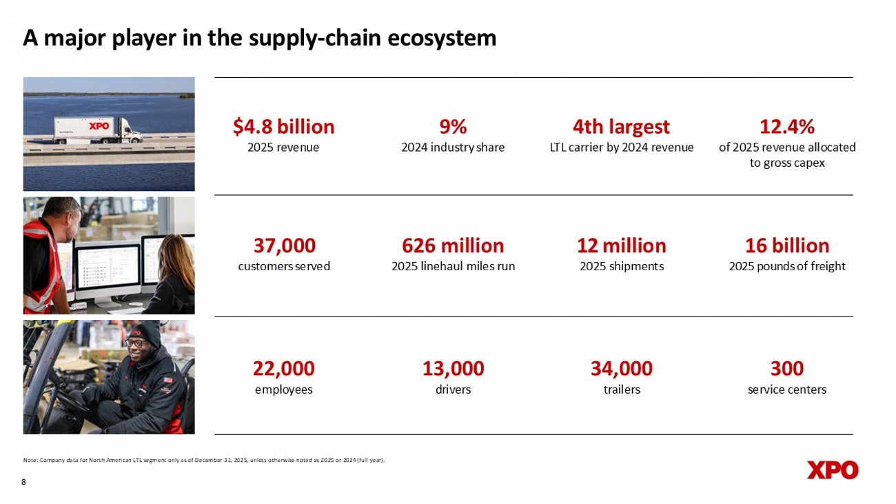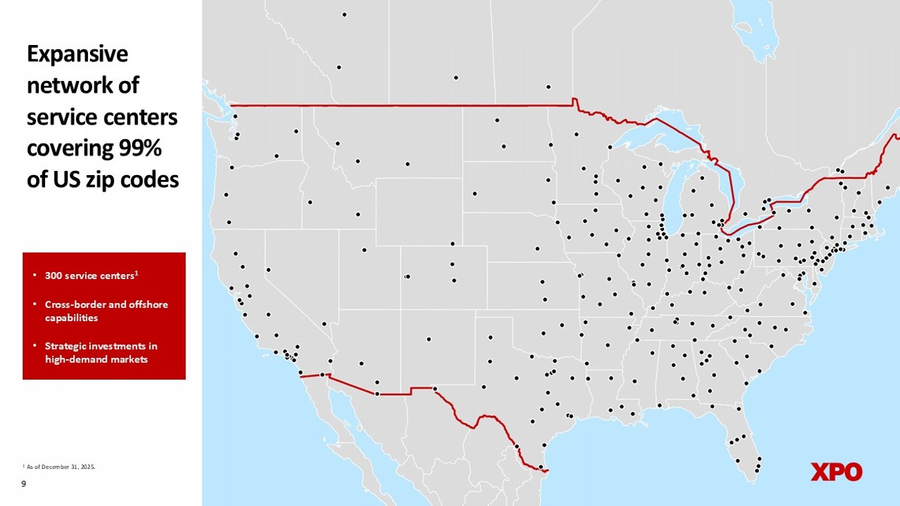 A major player in the supply - chain ecosystem Note: Company data for North American LTL segment only as of December 31, 2025, unless otherwise noted as 2025 or 2024 (full yea r). 4th largest LTL carrier by 2024 revenue 12.4% of 2025 revenue allocated to gross capex 12 million 2025 s hipments 37,000 customers served $4.8 billion 2025 revenue 9 % 2024 industry share 8 13,0 0 0 d rivers 34,0 0 0 t railers 1 6 billion 2025 pounds of freight 626 million 2025 l inehaul miles run 2 2 ,0 0 0 e mployees 300 service centers quarterly (bring back