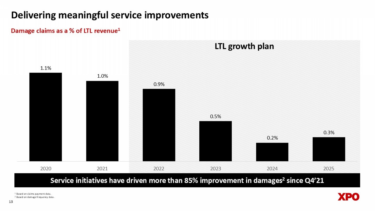 Provide best - in - class service Accelerate yield growth Drive cost efficiencies • Delivering above - market pricing gains aligned with service excellence • Expanding accessorial revenue from premium service offerings • Growing share of higher - yielding local channel with scaled - up local salesforce • Expanding use of AI in proprietary technology to enhance productivity • Insourcing linehaul miles to increase network efficiency, supporting incremental margins in an upcycle • Investing in fleet to drive lower maintenance costs and improved reliability 12 Executing on four key levers • Continually strengthening our value proposition through a world - class service culture • Incentivizing employees to deliver outstanding service quality for customers • Implementing tools for operational excellence in linehaul, dock, and pickup - and - delivery Invest in network for the long - term • Targeting capex of 8% to 12% of revenue on average through 2027 • Expanding linehaul fleet with tractors and in - house trailer manufacturing • Investing in network capacity to further improve service and enhance operating leverage