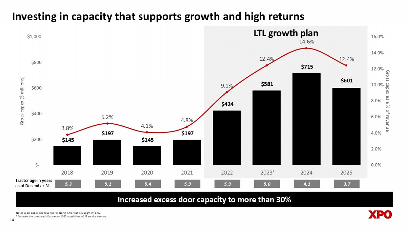 1 Based on claims payment data. 2 Based on damage frequency data. 13 Service initiatives have driven more than 85% improvement in damages 2 since Q4’21 Delivering meaningful service improvements Damage claims as a % of LTL revenue 1 LTL growth plan 1.1% 1.0% 0.9% 0.5% 0.2% 0.3% 2020 2021 2022 2023 2024 2025
