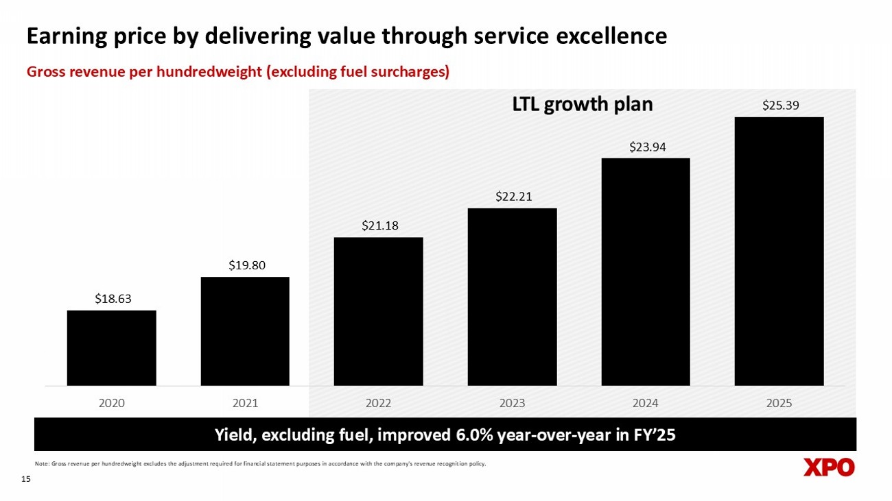 Investing in capacity that supports growth and high returns 14 Tractor age in years as of December 31 5.3 5.1 5.4 5.9 5.9 Note: Gross capex and revenue for North American LTL segment only. 1 Excludes the company’s December 2023 acquisition of 28 service centers. 5.0 1 Increased excess door capacity to more than 30% 4.1 LTL growth plan $601 $145 $197 $145 $197 $424 $581 $715 3.8% 5.2% 4.1% 4.8% 9.1% 12.4% 14.6% 12.4% 0.0% 2.0% 4.0% 6.0% 8.0% 10.0% 12.0% 14.0% 16.0% $- $200 $400 $600 $800 $1,000 2018 2019 2020 2021 2022 2023 2024 2025 Gross capex as a % of revenue Gross capex ($ millions) 3.7