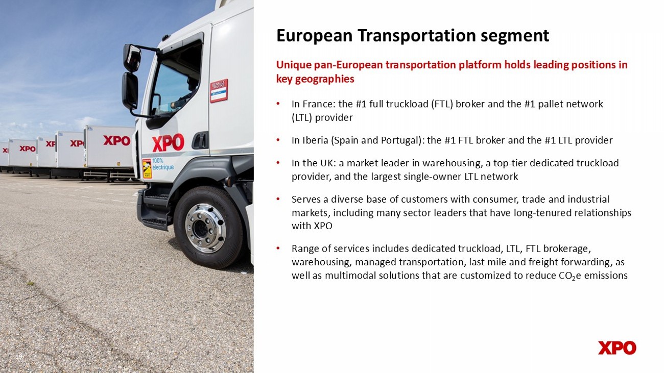 European Transportation segment • In France: the #1 full truckload (FTL) broker and the #1 pallet network (LTL) provider • In Iberia (Spain and Portugal): the #1 FTL broker and the #1 LTL provider • In the UK: a market leader in warehousing, a top - tier dedicated truckload provider, and the largest single - owner LTL network • Serves a diverse base of customers with consumer, trade and industrial markets, including many sector leaders that have long - tenured relationships with XPO • Range of services includes dedicated truckload, LTL, FTL brokerage, warehousing, managed transportation, last mile and freight forwarding, as well as multimodal solutions that are customized to reduce CO 2 e emissions Unique pan - European transportation platform holds leading positions in key geographies 19 19