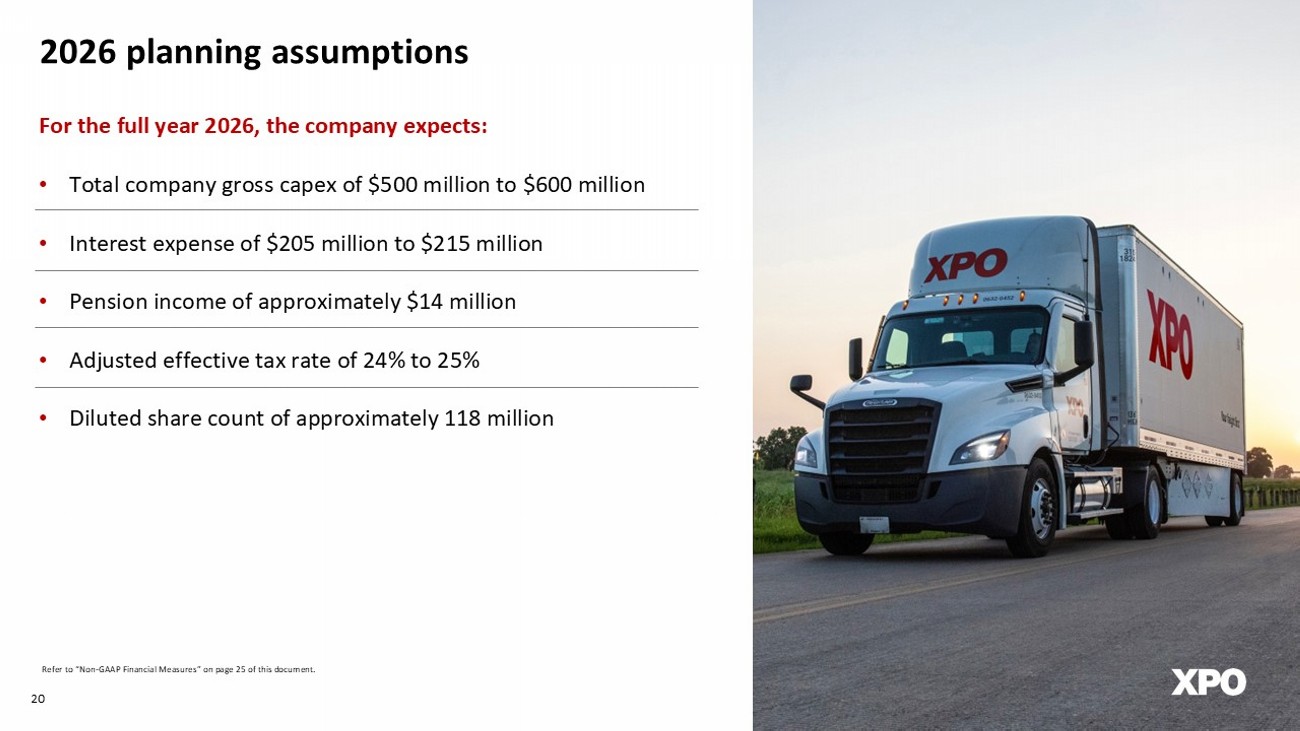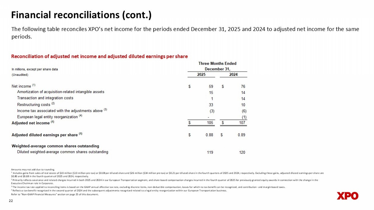 Financial reconciliations (cont.) The following table reconciles XPO’s net income for the periods ended December 31, 2025 and 2024 to adjusted net income for the same periods. 22 Amounts may not add due to rounding. 1 Includes gains from sales of real estate of $10 million ($13 million pre - tax) or $0.08 per diluted share and $26 million ($34 m illion pre - tax) or $0.21 per diluted share in the fourth quarters of 2025 and 2024, respectively. Excluding these gains, adjusted diluted earnings per share are $0.80 and $0.68 in the fourth quarters of 2025 and 2024, respectively. 2 Primarily reflects severance and related charges incurred in both 2025 and 2024 in our European Transportation segment, and s har e - based compensation charges incurred in the fourth quarter of 2025 for previously granted equity awards in connection with the change in the Executive Chairman role in Corporate. 3 The income tax rate applied to reconciling items is based on the GAAP annual effective tax rate, excluding discrete items, no n - d eductible compensation, losses for which no tax benefit can be recognized, and contribution - and margin - based taxes. 4 Reflects a tax benefit recognized in the second quarter of 2024 and the subsequent adjustments recognized related to a legal ent ity reorganization within our European Transportation business. Refer to “Non - GAAP Financial Measures” section on page 25 of this document. Reconciliation of adjusted net income and adjusted diluted earnings per share In millions, except per share data (Unaudited) Net income (1) $ 59 $ 76 Amortization of acquisition-related intangible assets 15 14 Transaction and integration costs 1 14 Restructuring costs (2) 33 10 Income tax associated with the adjustments above (3) (3) (6) European legal entity reorganization (4) - (1) Adjusted net income (1) $ 105 $ 107 Adjusted diluted earnings per share (1) $ 0.88 $ 0.89 Weighted-average common shares outstanding Diluted weighted-average common shares outstanding 119 120 2025 2024 Three Months Ended December 31,