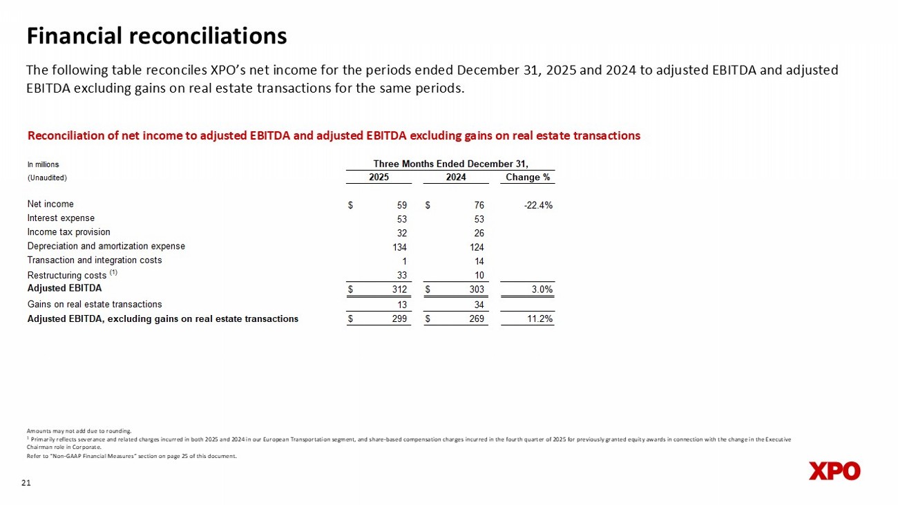 Financial reconciliations The following table reconciles XPO’s net income for the periods ended December 31, 2025 and 2024 to adjusted EBITDA and adjusted EBITDA excluding gains on real estate transactions for the same periods. 21 Reconciliation of net income to adjusted EBITDA and adjusted EBITDA excluding gains on real estate transactions Amounts may not add due to rounding. 1 Primarily reflects severance and related charges incurred in both 2025 and 2024 in our European Transportation segment, and s ha re - based compensation charges incurred in the fourth quarter of 2025 for previously granted equity awards in connection with the change in the Executive Chairman role in Corporate. Refer to “Non - GAAP Financial Measures” section on page 25 of this document. In millions (Unaudited) Change % Net income $ 59 $ 76 -22.4% Interest expense 53 53 Income tax provision 32 26 Depreciation and amortization expense 134 124 Transaction and integration costs 1 14 Restructuring costs (1) 33 10 Adjusted EBITDA $ 312 $ 303 3.0% Gains on real estate transactions 13 34 Adjusted EBITDA, excluding gains on real estate transactions $ 299 $ 269 11.2% Three Months Ended December 31, 2025 2024
