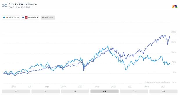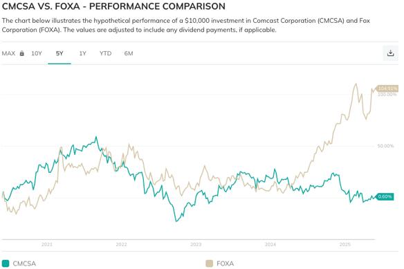 But in light of the NBC/MSNBC failures, an apt (but admittedly not perfect) comparison could be made to Fox Corporation, whose most high-profile properties are its over-air broadcast network, news and sports cable channels, and local television stations. Since spinning off its entertainment assets to Disney in 2019, Fox’s stock performance compared to Comcast looks like this: