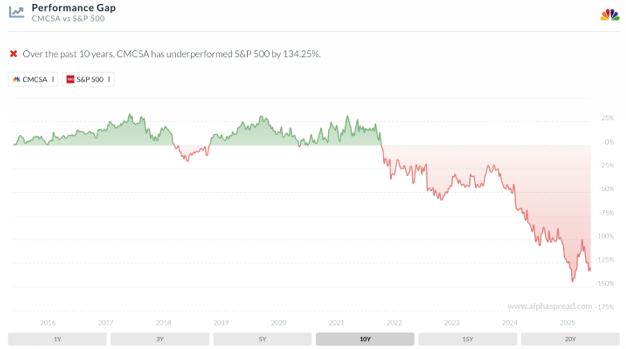 The damage done to NBC and MSNBC by allowing its producers and personalities to feed news cycles with phony narratives and hysterical political analysis have cost Comcast and its shareholders dearly. The Company’s stock has performed woefully compared to the S&P 500 over both short- and long-term periods, as we’ve already shown above. Unsurprisingly, its record against its competitors is no better.