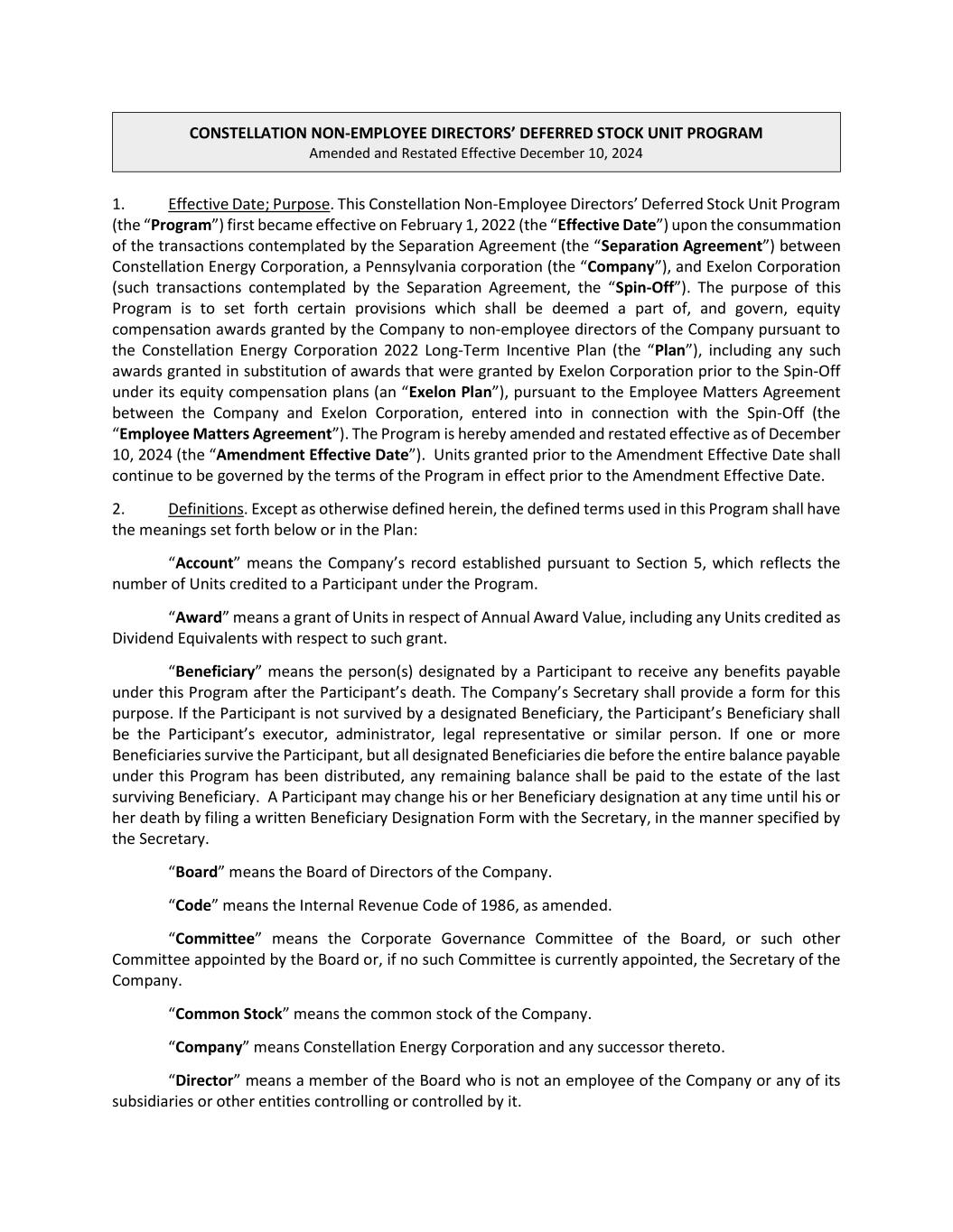 CONSTELLATION NON-EMPLOYEE DIRECTORS’ DEFERRED STOCK UNIT PROGRAM Amended and Restated Effective December 10, 2024 1. Effective Date; Purpose. This Constellation Non-Employee Directors’ Deferred Stock Unit Program (the “Program”) first became effective on February 1, 2022 (the “Effective Date”) upon the consummation of the transactions contemplated by the Separation Agreement (the “Separation Agreement”) between Constellation Energy Corporation, a Pennsylvania corporation (the “Company”), and Exelon Corporation (such transactions contemplated by the Separation Agreement, the “Spin-Off”). The purpose of this Program is to set forth certain provisions which shall be deemed a part of, and govern, equity compensation awards granted by the Company to non-employee directors of the Company pursuant to the Constellation Energy Corporation 2022 Long-Term Incentive Plan (the “Plan”), including any such awards granted in substitution of awards that were granted by Exelon Corporation prior to the Spin-Off under its equity compensation plans (an “Exelon Plan”), pursuant to the Employee Matters Agreement between the Company and Exelon Corporation, entered into in connection with the Spin-Off (the “Employee Matters Agreement”). The Program is hereby amended and restated effective as of December 10, 2024 (the “Amendment Effective Date”). Units granted prior to the Amendment Effective Date shall continue to be governed by the terms of the Program in effect prior to the Amendment Effective Date. 2. Definitions. Except as otherwise defined herein, the defined terms used in this Program shall have the meanings set forth below or in the Plan: “Account” means the Company’s record established pursuant to Section 5, which reflects the number of Units credited to a Participant under the Program. “Award” means a grant of Units in respect of Annual Award Value, including any Units credited as Dividend Equivalents with respect to such grant. “Beneficiary” means the person(s) designated by a Participant to receive any benefits payable under this Program after the Participant’s death. The Company’s Secretary shall provide a form for this purpose. If the Participant is not survived by a designated Beneficiary, the Participant’s Beneficiary shall be the Participant’s executor, administrator, legal representative or similar person. If one or more Beneficiaries survive the Participant, but all designated Beneficiaries die before the entire balance payable under this Program has been distributed, any remaining balance shall be paid to the estate of the last surviving Beneficiary. A Participant may change his or her Beneficiary designation at any time until his or her death by filing a written Beneficiary Designation Form with the Secretary, in the manner specified by the Secretary. “Board” means the Board of Directors of the Company. “Code” means the Internal Revenue Code of 1986, as amended. “Committee” means the Corporate Governance Committee of the Board, or such other Committee appointed by the Board or, if no such Committee is currently appointed, the Secretary of the Company. “Common Stock” means the common stock of the Company. “Company” means Constellation Energy Corporation and any successor thereto. “Director” means a member of the Board who is not an employee of the Company or any of its subsidiaries or other entities controlling or controlled by it.