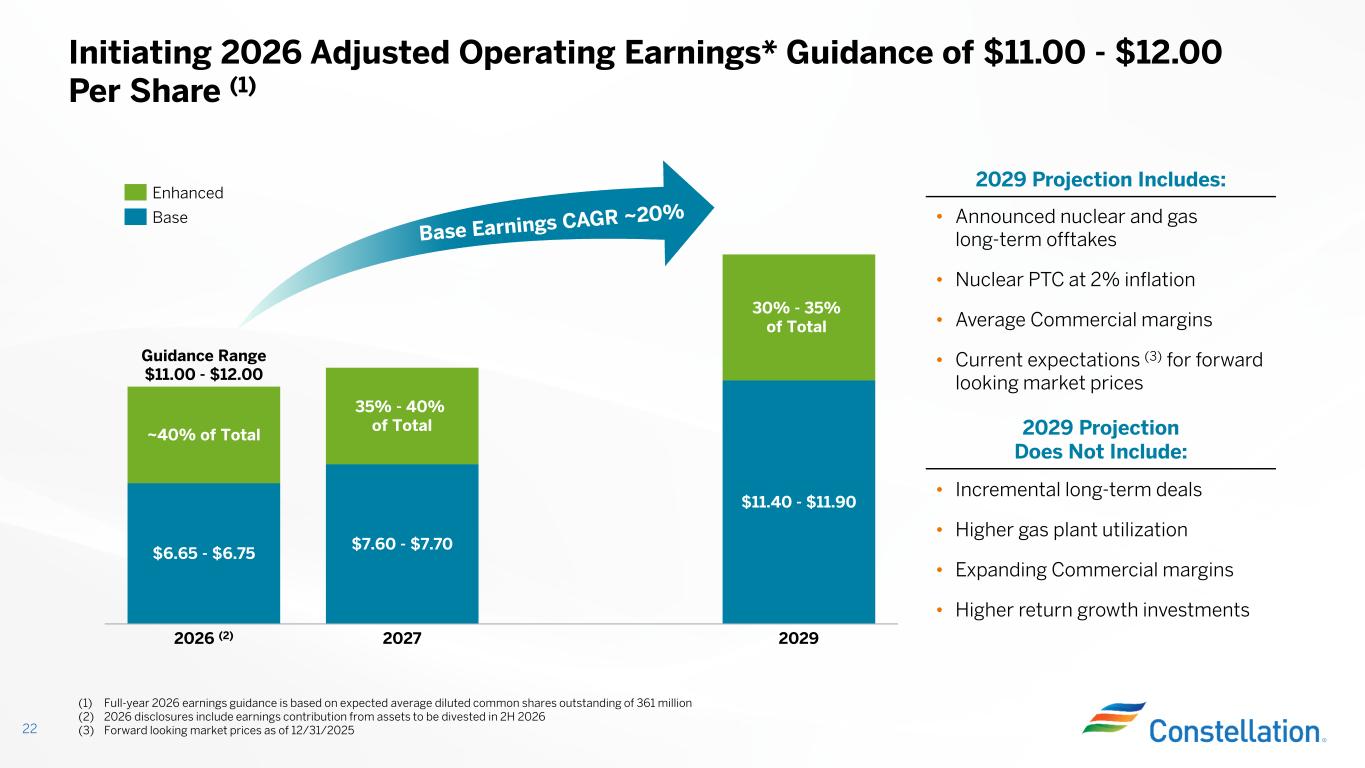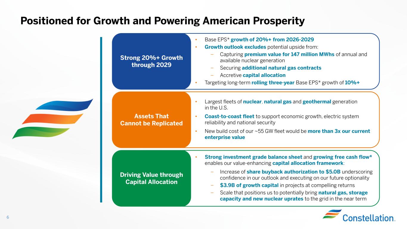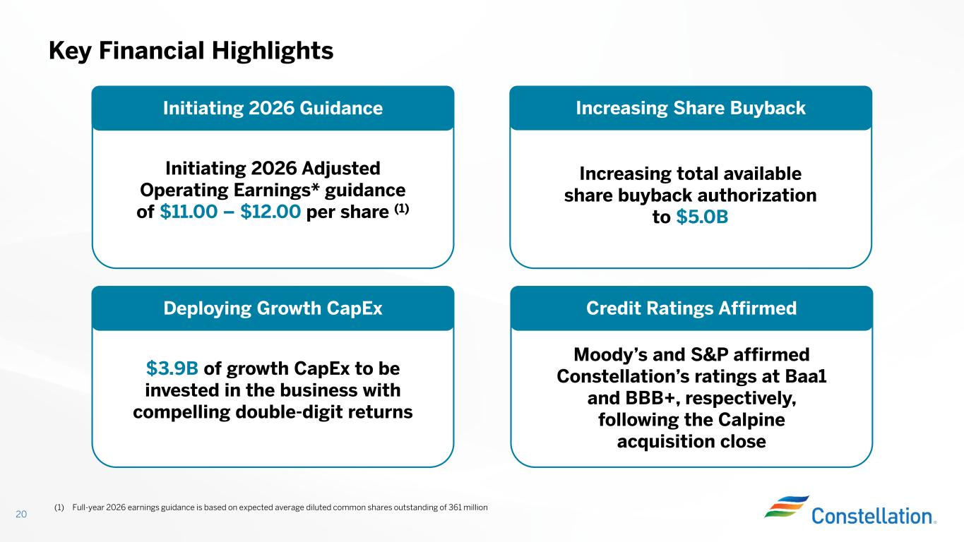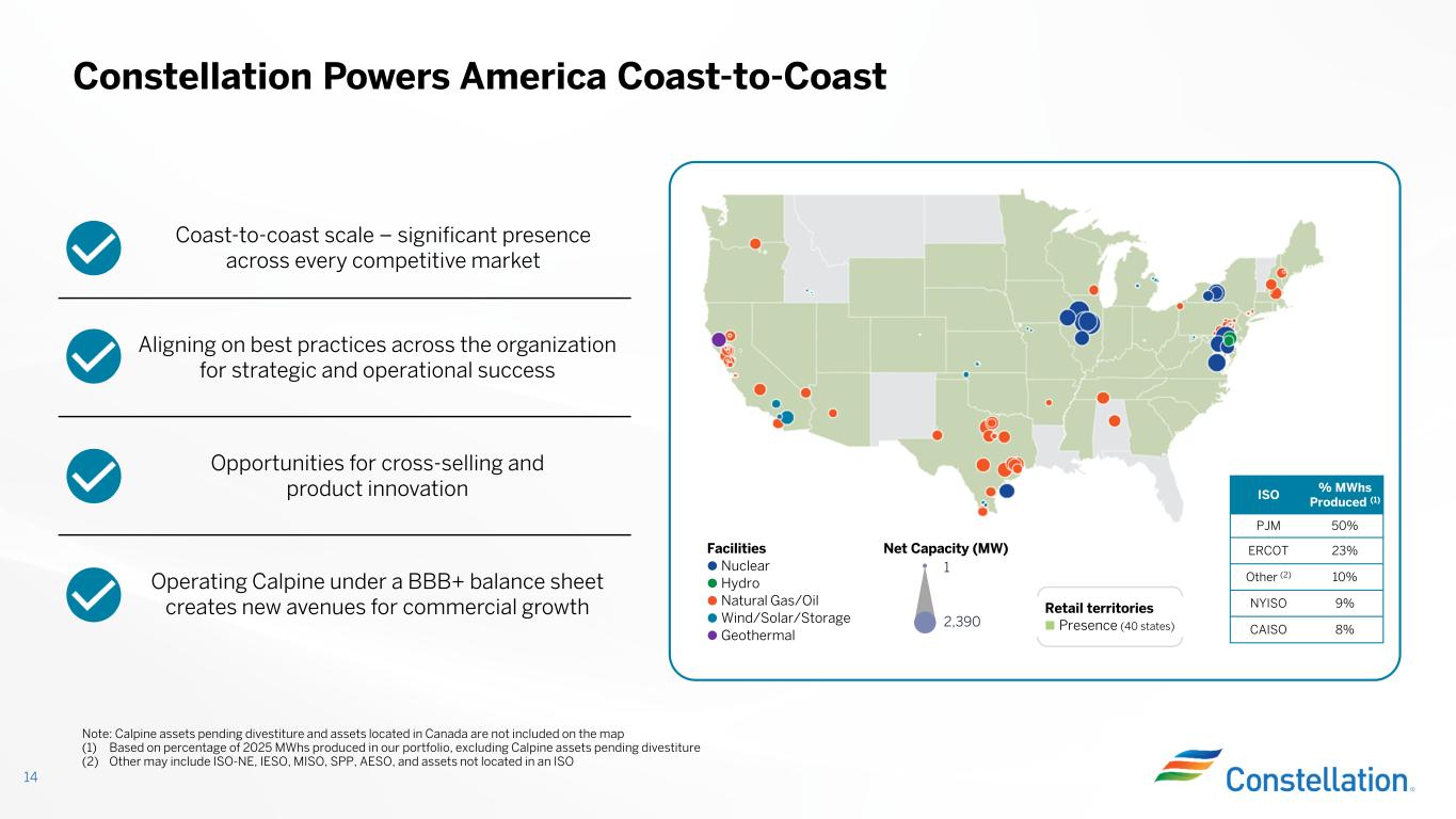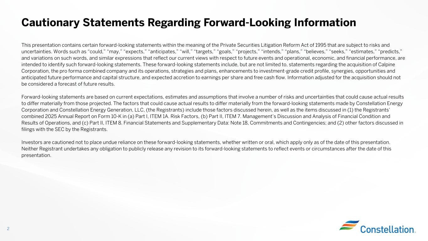 This presentation contains certain forward-looking statements within the meaning of the Private Securities Litigation Reform Act of 1995 that are subject to risks and uncertainties. Words such as “could,” “may,” “expects,” “anticipates,” “will,” “targets,” “goals,” “projects,” “intends,” “plans,” “believes,” “seeks,” “estimates,” “predicts,” and variations on such words, and similar expressions that reflect our current views with respect to future events and operational, economic, and financial performance, are intended to identify such forward-looking statements. These forward-looking statements include, but are not limited to, statements regarding the acquisition of Calpine Corporation, the pro forma combined company and its operations, strategies and plans, enhancements to investment-grade credit profile, synergies, opportunities and anticipated future performance and capital structure, and expected accretion to earnings per share and free cash flow. Information adjusted for the acquisition should not be considered a forecast of future results. Forward-looking statements are based on current expectations, estimates and assumptions that involve a number of risks and uncertainties that could cause actual results to differ materially from those projected. The factors that could cause actual results to differ materially from the forward-looking statements made by Constellation Energy Corporation and Constellation Energy Generation, LLC, (the Registrants) include those factors discussed herein, as well as the items discussed in (1) the Registrants’ combined 2025 Annual Report on Form 10-K in (a) Part I, ITEM 1A. Risk Factors, (b) Part II, ITEM 7. Management’s Discussion and Analysis of Financial Condition and Results of Operations, and (c) Part II, ITEM 8. Financial Statements and Supplementary Data: Note 18, Commitments and Contingencies; and (2) other factors discussed in filings with the SEC by the Registrants. Investors are cautioned not to place undue reliance on these forward-looking statements, whether written or oral, which apply only as of the date of this presentation. Neither Registrant undertakes any obligation to publicly release any revision to its forward-looking statements to reflect events or circumstances after the date of this presentation. Cautionary Statements Regarding Forward-Looking Information 2