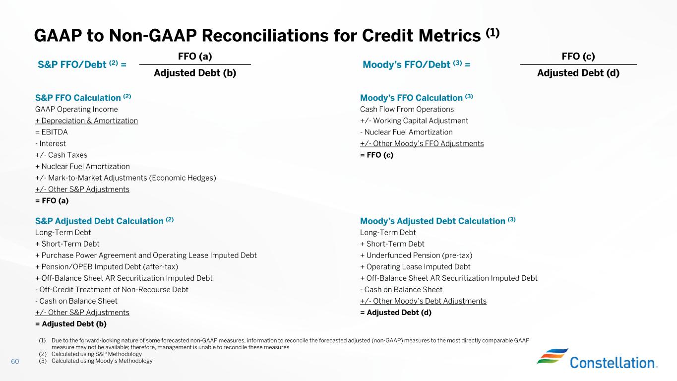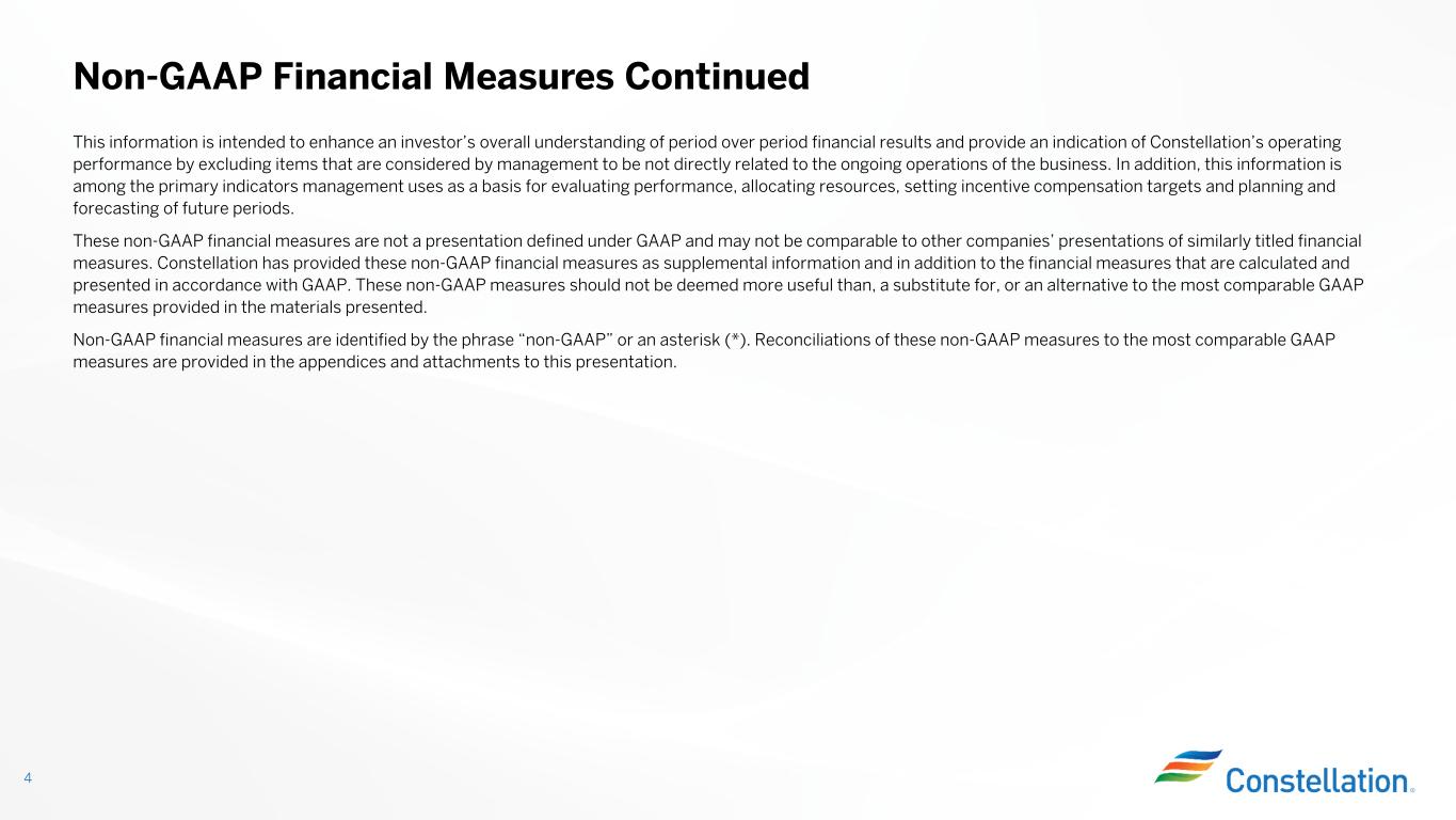 The Registrants report their financial results in accordance with accounting principles generally accepted in the United States (GAAP). Constellation supplements the reporting of financial information determined in accordance with GAAP with certain non-GAAP financial measures, including: • Adjusted Operating Earnings (and/or its per share equivalent) exclude certain costs, expenses, gains and losses and other specified items, including mark-to-market adjustments from economic hedging activities, interest rate swaps, and fair value adjustments related to gas imbalances and equity investments, decommissioning related activity, asset impairments, certain amounts associated with plant retirements and divestitures, pension and other post-employment benefits (OPEB) non-service credits, and other items as set forth in the Appendix • Free cash flows before growth (FCFbG) is cash flows from operations less capital expenditures under GAAP for maintenance and nuclear fuel, equity investments, and adjusted for changes in collateral and non-recurring costs-to-achieve (CTA) • Adjusted gross margin is defined as adjusted operating revenues less adjusted purchased power and fuel expense, excluding revenue related to decommissioning, gross receipts tax, variable interest entities, and net of direct cost of sales for certain end-user businesses – Adjusted operating revenues excludes the mark-to-market impact of economic hedging activities due to the volatility and unpredictability of the future changes in commodity prices – Adjusted purchased power and fuel excludes the mark-to-market impact of economic hedging activities and fair value adjustments related to gas imbalances due to the volatility and unpredictability of the future changes in commodity prices • Adjusted operating and maintenance (O&M) excludes direct cost of sales for certain end-user businesses, Asset Retirement Obligation (ARO) accretion expense from unregulated units and decommissioning costs that do not affect profit and loss, the impact from operating and maintenance expense related to variable interest entities at Constellation, and other items as set forth in the reconciliation in the Appendix Due to the forward-looking nature of our Adjusted Operating Earnings guidance, Projected Adjusted Gross Margin, and Projected Free Cash Flow Before Growth, we are unable to reconcile these non-GAAP financial measures to the comparable GAAP measures given the inherent uncertainty required in projecting gains and losses associated with the various fair value adjustments required by GAAP. These adjustments include future changes in fair value impacting the derivative instruments utilized in our current business operations, as well as the debt and equity securities held within our nuclear decommissioning trusts, which may have a material impact on our future GAAP results. Non-GAAP Financial Measures 3