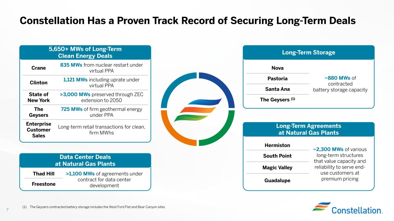 Positioned for Growth and Powering American Prosperity 6 Strong 20%+ Growth through 2029 • Base EPS* growth of 20%+ from 2026-2029 • Growth outlook excludes potential upside from: – Capturing premium value for 147 million MWhs of annual and available nuclear generation – Securing additional natural gas contracts – Accretive capital allocation • Targeting long-term rolling three-year Base EPS* growth of 10%+ Assets That Cannot be Replicated • Largest fleets of nuclear, natural gas and geothermal generation in the U.S. • Coast-to-coast fleet to support economic growth, electric system reliability and national security • New build cost of our ~55 GW fleet would be more than 3x our current enterprise value Driving Value through Capital Allocation • Strong investment grade balance sheet and growing free cash flow* enables our value-enhancing capital allocation framework: – Increase of share buyback authorization to $5.0B underscoring confidence in our outlook and executing on our future optionality – $3.9B of growth capital in projects at compelling returns – Scale that positions us to potentially bring natural gas, storage capacity and new nuclear uprates to the grid in the near term