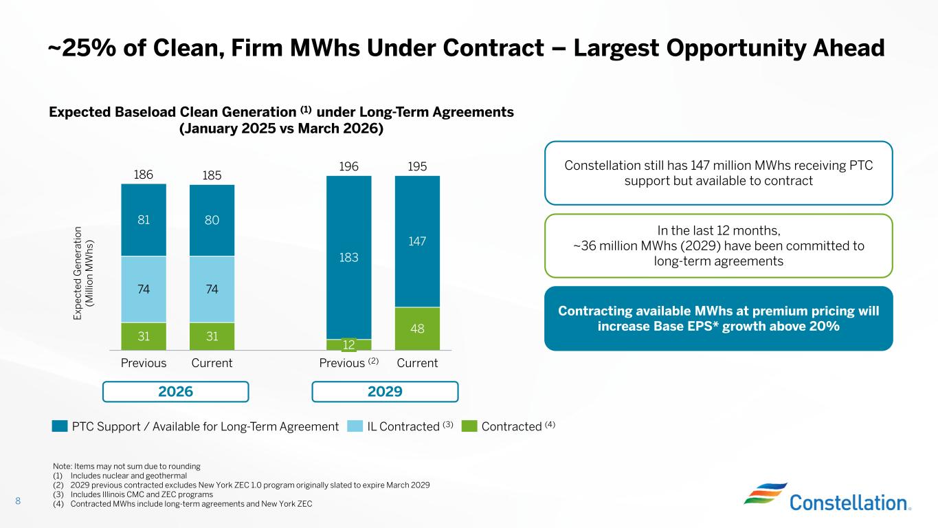 ~2,300 MWs of various long-term structures that value capacity and reliability to serve end- use customers at premium pricing Hermiston South Point Magic Valley Guadalupe Constellation Has a Proven Track Record of Securing Long-Term Deals 7 835 MWs from nuclear restart under virtual PPA Crane 1,121 MWs including uprate under virtual PPA Clinton >3,000 MWs preserved through ZEC extension to 2050 State of New York 725 MWs of firm geothermal energy under PPA The Geysers Long-term retail transactions for clean, firm MWhs Enterprise Customer Sales >1,100 MWs of agreements under contract for data center development Thad Hill Freestone ~880 MWs of contracted battery storage capacity Nova Pastoria Santa Ana The Geysers (1) (1) The Geysers contracted battery storage includes the West Ford Flat and Bear Canyon sites 5,650+ MWs of Long-Term Clean Energy Deals Long-Term Storage Data Center Deals at Natural Gas Plants Long-Term Agreements at Natural Gas Plants