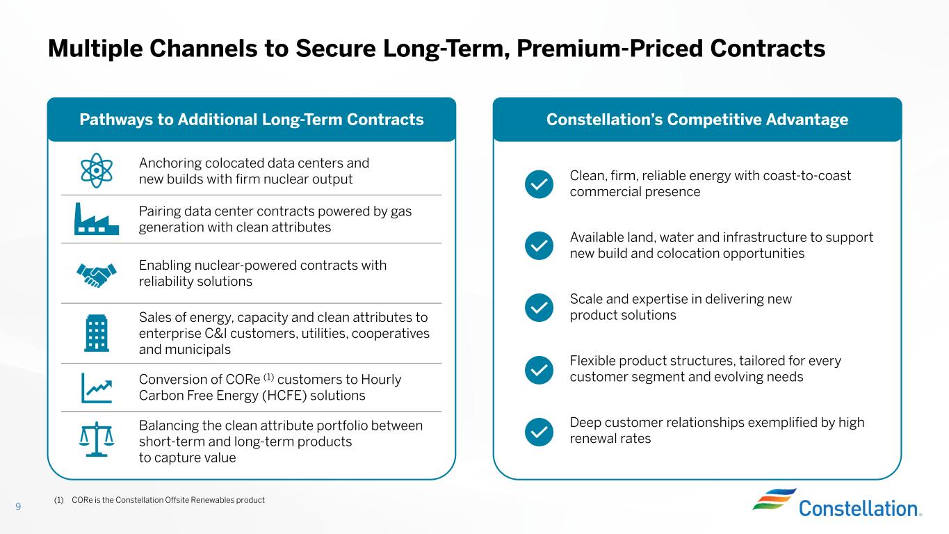 ~25% of Clean, Firm MWhs Under Contract – Largest Opportunity Ahead 8 E xp ec te d G en er at io n (M ill io n M W h s) Note: Items may not sum due to rounding (1) Includes nuclear and geothermal (2) 2029 previous contracted excludes New York ZEC 1.0 program originally slated to expire March 2029 (3) Includes Illinois CMC and ZEC programs (4) Contracted MWhs include long-term agreements and New York ZEC In the last 12 months, ~36 million MWhs (2029) have been committed to long-term agreements 31 31 48 74 74 183 147 81 80 Previous Current 12 Previous (2) Current 186 185 196 195 PTC Support / Available for Long-Term Agreement IL Contracted (3) Contracted (4) Expected Baseload Clean Generation (1) under Long-Term Agreements (January 2025 vs March 2026) 2026 2029 Constellation still has 147 million MWhs receiving PTC support but available to contract Contracting available MWhs at premium pricing will increase Base EPS* growth above 20%