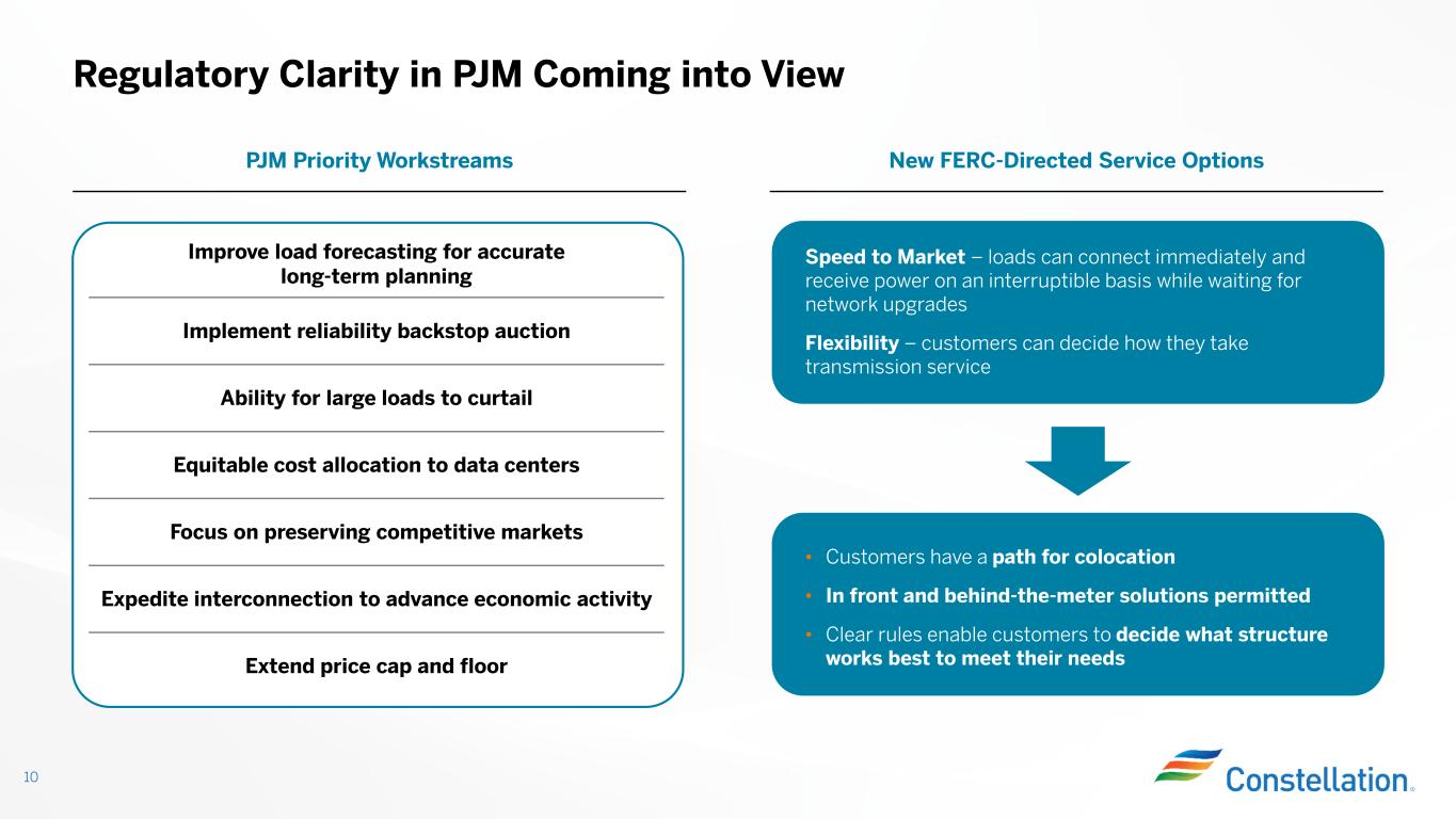 Multiple Channels to Secure Long-Term, Premium-Priced Contracts 9 Clean, firm, reliable energy with coast-to-coast commercial presence Available land, water and infrastructure to support new build and colocation opportunities Scale and expertise in delivering new product solutions Flexible product structures, tailored for every customer segment and evolving needs Deep customer relationships exemplified by high renewal rates Anchoring colocated data centers and new builds with firm nuclear output Pairing data center contracts powered by gas generation with clean attributes Enabling nuclear-powered contracts with reliability solutions Sales of energy, capacity and clean attributes to enterprise C&I customers, utilities, cooperatives and municipals Conversion of CORe (1) customers to Hourly Carbon Free Energy (HCFE) solutions Balancing the clean attribute portfolio between short-term and long-term products to capture value Pathways to Additional Long-Term Contracts Constellation’s Competitive Advantage (1) CORe is the Constellation Offsite Renewables product