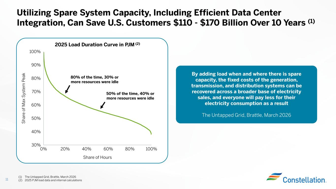 0% 20% 40% 60% 80% 100% 30% 40% 50% 60% 70% 80% 90% 100% Share of Hours S h ar e of M ax S ys te m P ea k Utilizing Spare System Capacity, Including Efficient Data Center Integration, Can Save U.S. Customers $110 - $170 Billion Over 10 Years (1) 11 50% of the time, 40% or more resources were idle 80% of the time, 30% or more resources were idle (1) The Untapped Grid, Brattle, March 2026 (2) 2025 PJM load data and internal calculations By adding load when and where there is spare capacity, the fixed costs of the generation, transmission, and distribution systems can be recovered across a broader base of electricity sales, and everyone will pay less for their electricity consumption as a result The Untapped Grid, Brattle, March 2026 2025 Load Duration Curve in PJM (2)